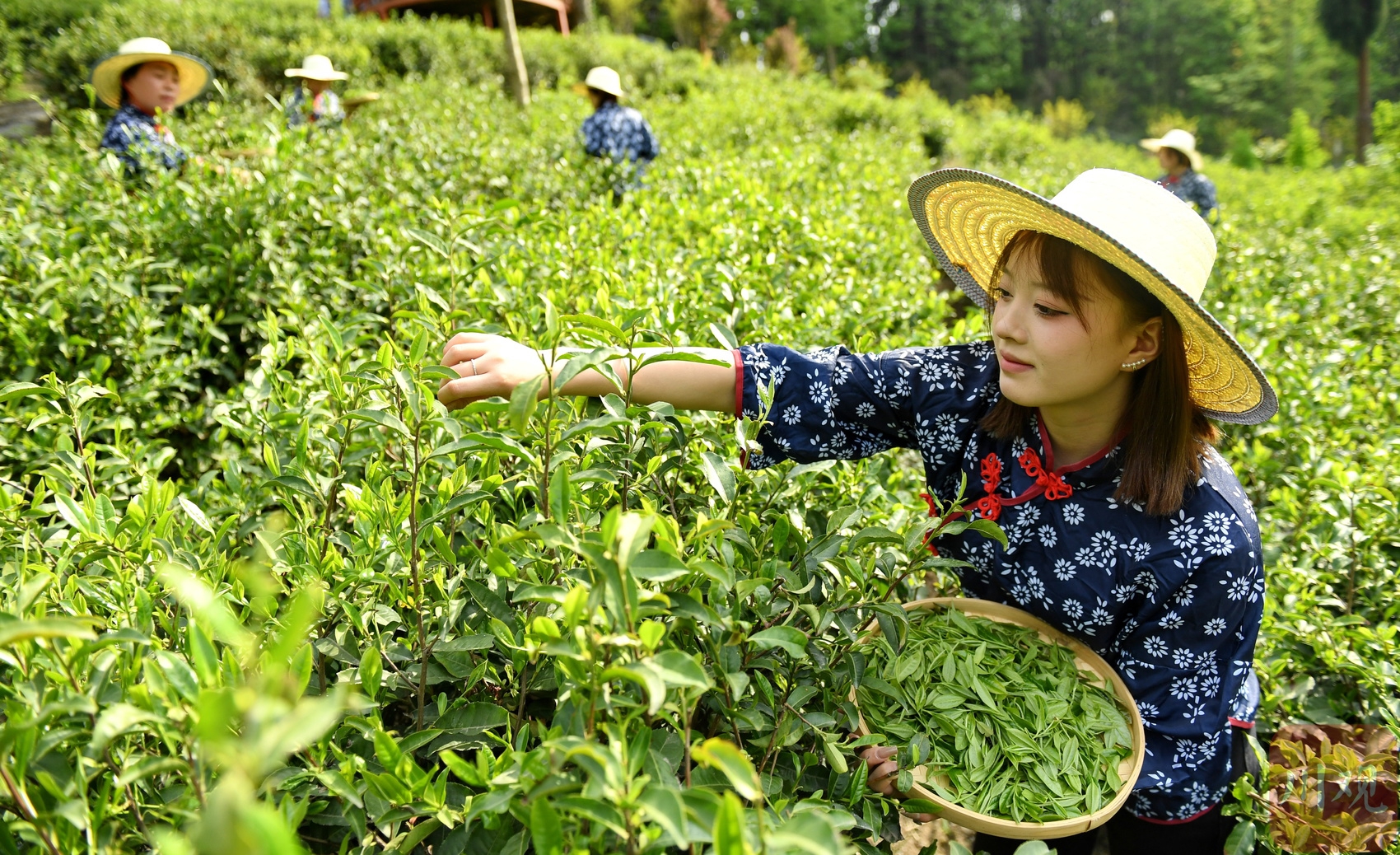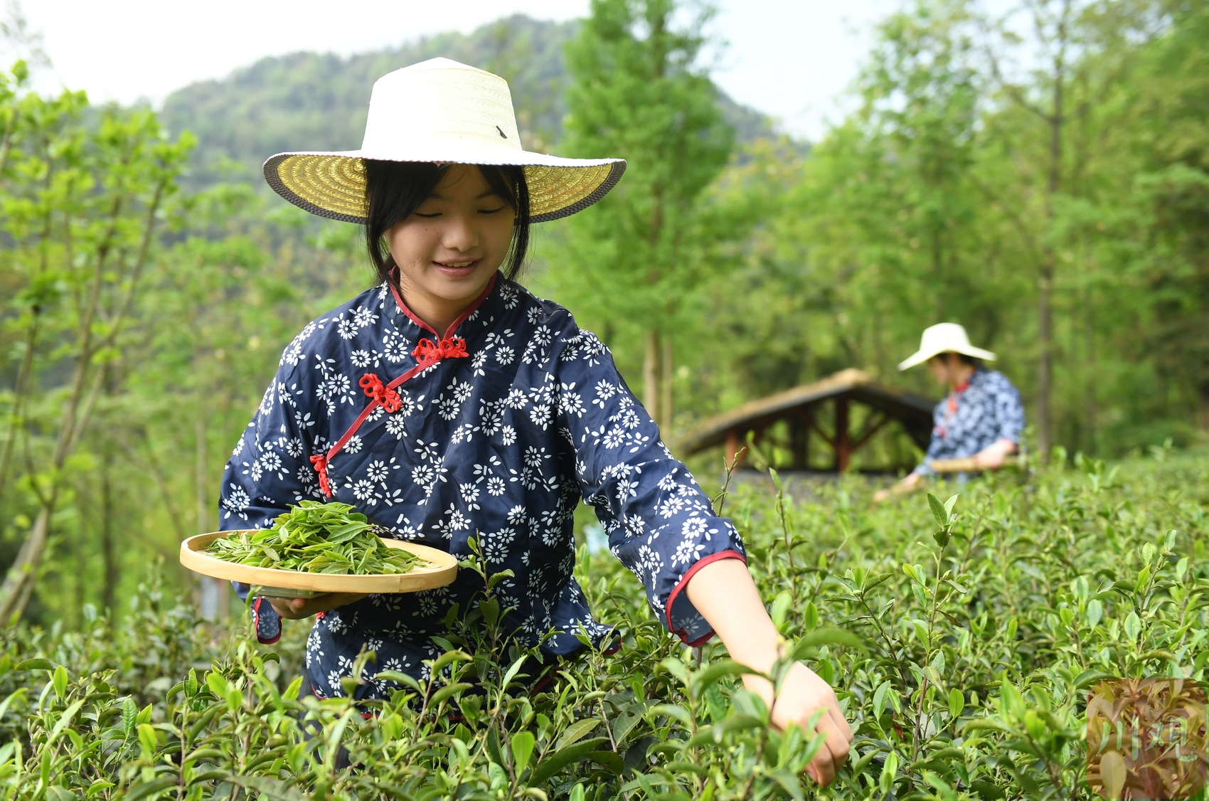 在四川省阿坝州汶川县水磨镇“等风来”茶园,当地茶农正在采茶。