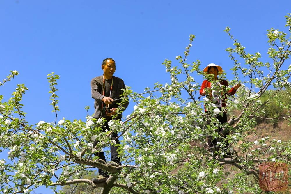 视频为4月22日,在该县宜东镇,漫山的粉白色的苹果花随风摇曳,汇聚成为花的海洋。果农们在林间奔走,开展授粉、疏花、施肥等管护工作,确保果树丰产丰收。