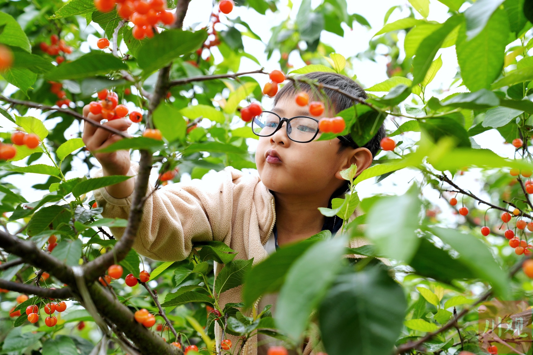 在樱桃成熟的季节,小朋友在樱桃树上实现了樱桃自由