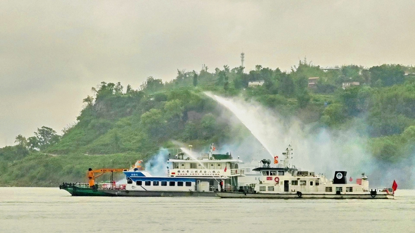演练模拟客渡船“弥陀号”从弥陀渡口开往神臂城渡口横渡过程中,与“泸碧水1号”发生碰撞。船上乘客发生混乱,导致1名乘客落水。