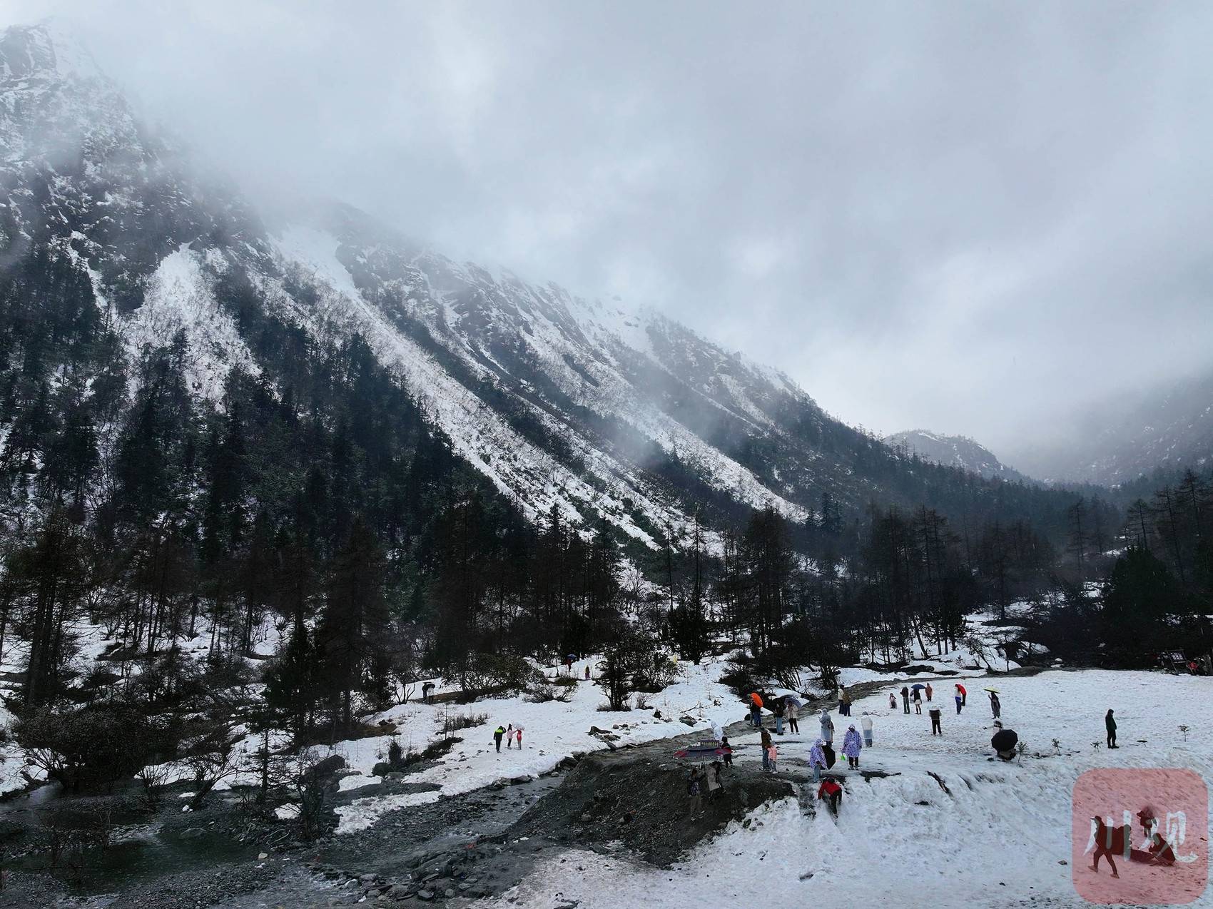 5月3日,四川阿坝州理小隧道外飘起了雪,不少游客把车停在公路边玩起了雪。