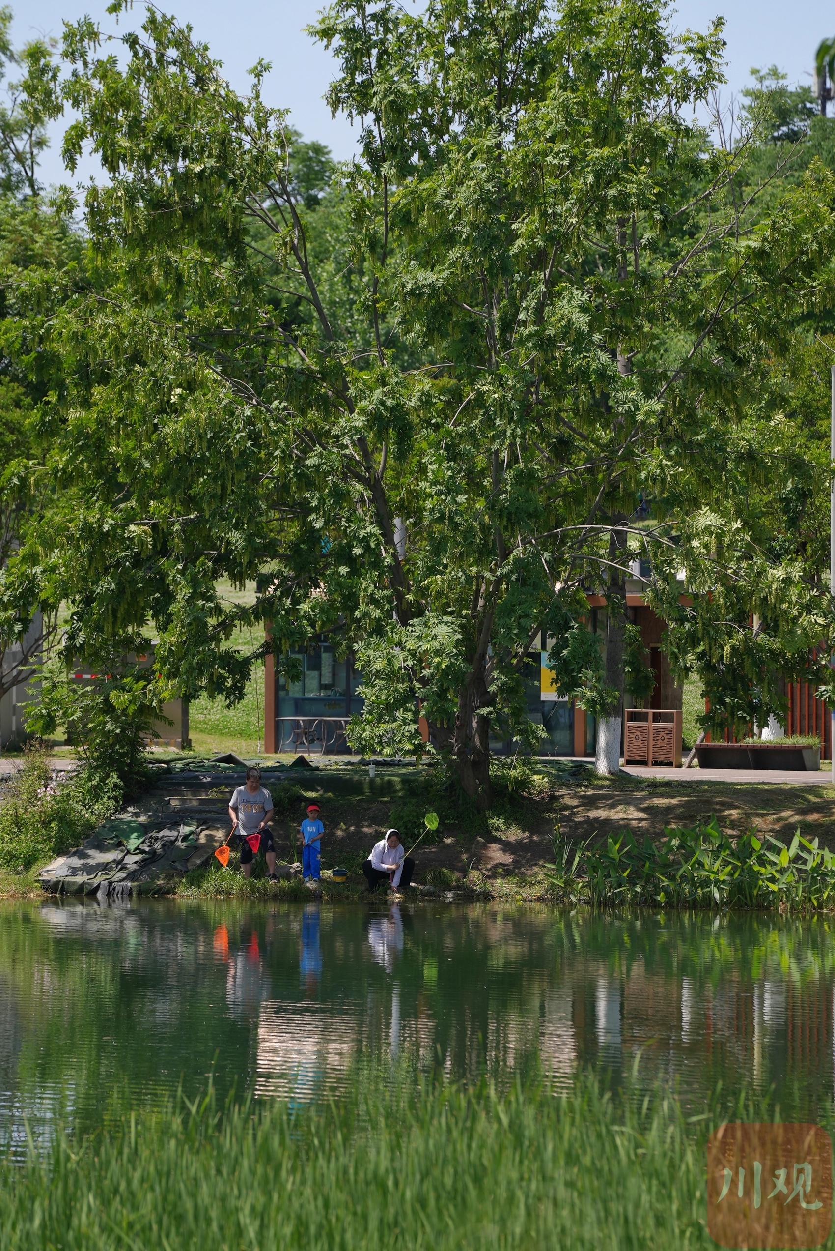 池塘边,家长带着小朋友玩水嬉戏。