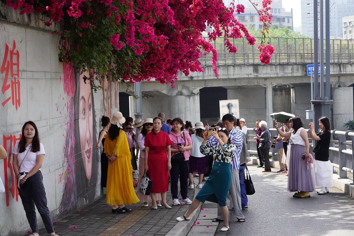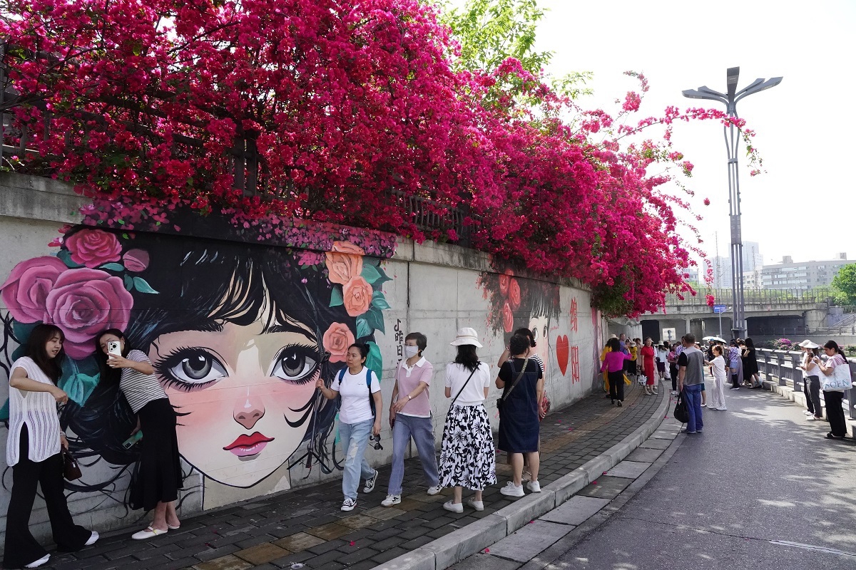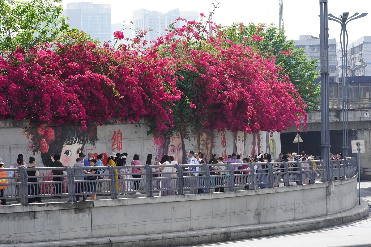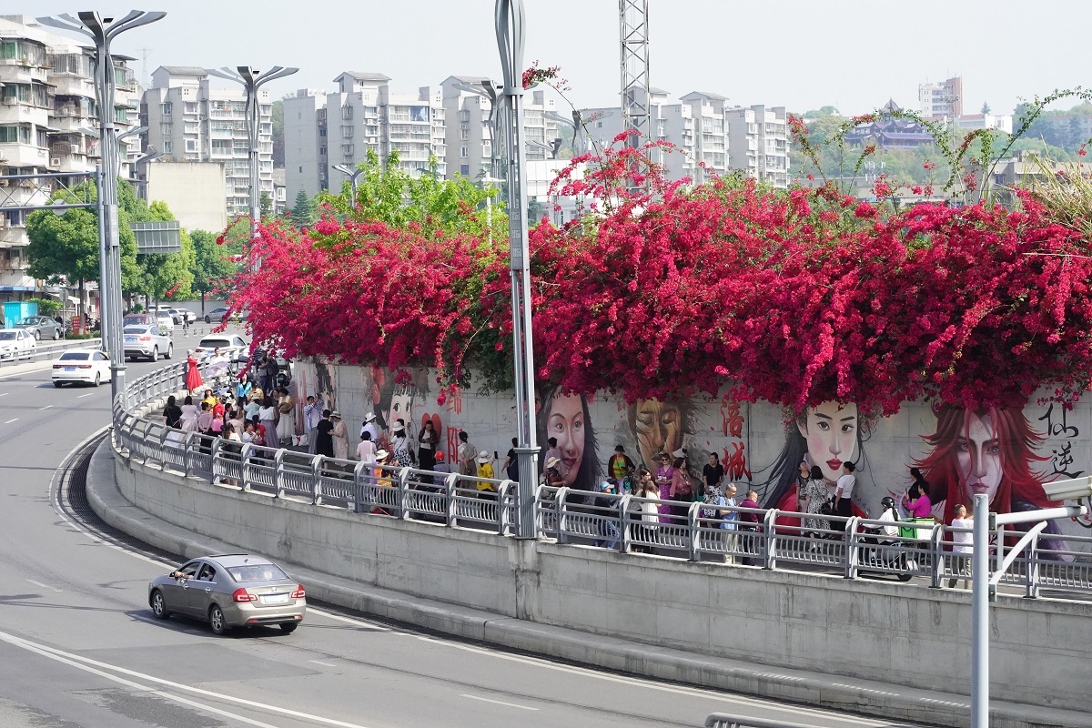 5月8日,在绵阳市涪城区剑南路西段一处的墙面上,垂落的三角梅与墙绘作品融为一体,为城市美景增添了一份靓色,不少市民游客被眼前的风景所吸引住,纷纷驻足拍照打卡。