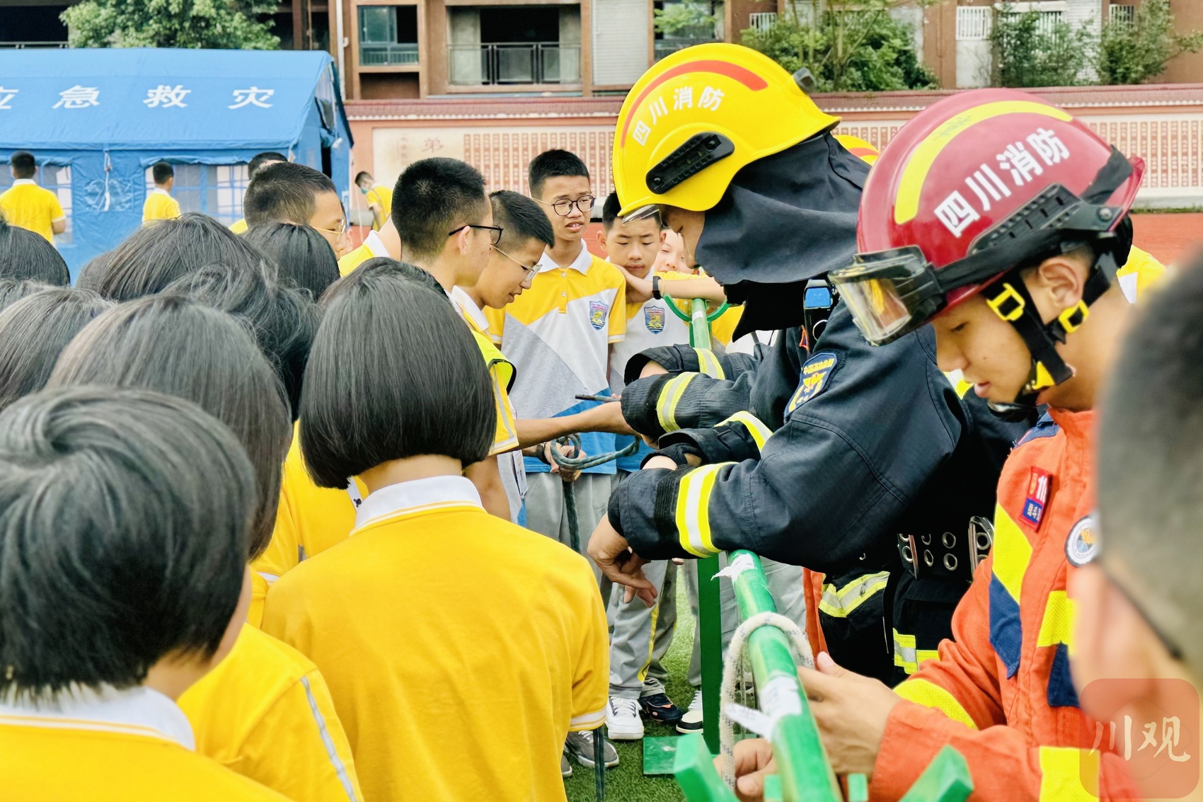 5月9日上午9时许,泸县二外梁才学校原本宁静的校园响起警报声,“呜——呜——”声下,霎时间,全校2000余名师生在教师和应急、消防人员的引导中,沿预定逃生路线快速有序撤离至操场安全区域,全程耗时4分46秒。