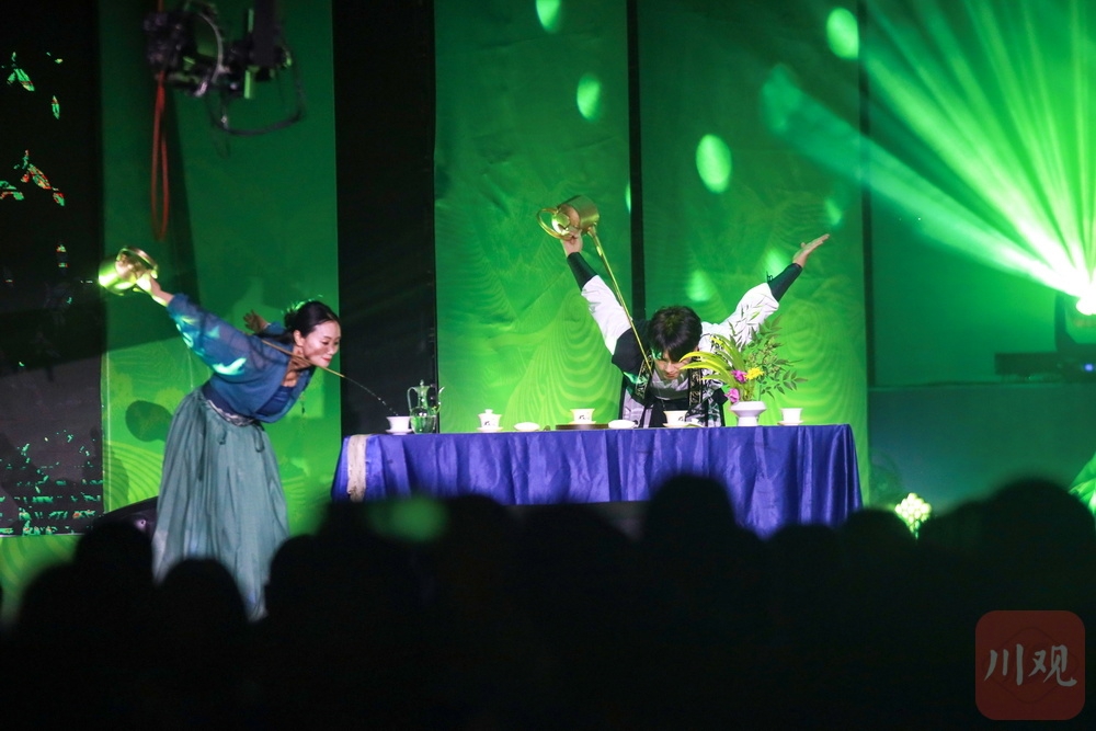 展演以时长60分钟的“村晚”文化展演为核心,在歌伴舞《在希望的田野上》的激昂旋律中拉开序幕,非遗节目《牛儿灯·芒种》、茶文化主题节目《雨润茗香》、舞蹈《达瓦勒》、茶艺《古道欢歌》等节目接连上演,已不同的艺术形式演绎了雅安的茶马古道文化与民族风情。