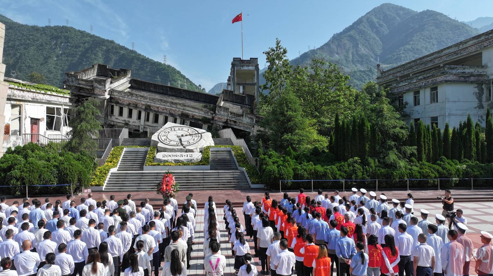 2025年5月12日,在四川省阿坝州汶川县映秀镇漩口中学地震遗址,党员干部和群众代表向汶川特大地震罹难同胞和在抗震救灾中捐躯的英雄默哀。