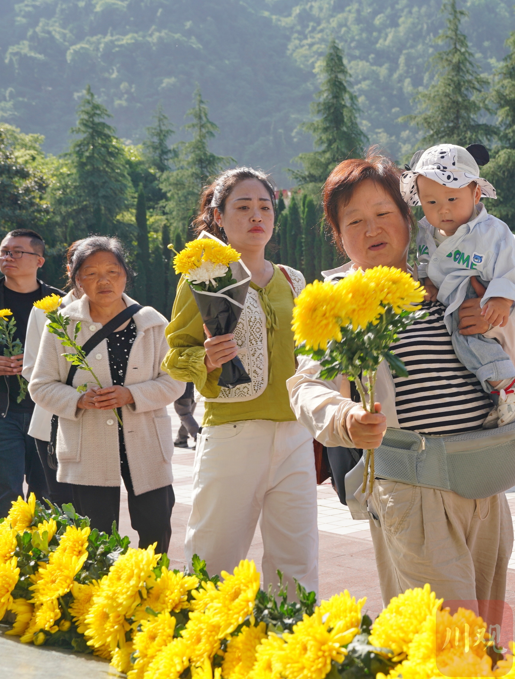 2025年5月12日,在四川省阿坝州汶川县映秀镇漩口中学地震遗址,群众向汶川特大地震罹难同胞和在抗震救灾中捐躯的英雄敬献鲜花。