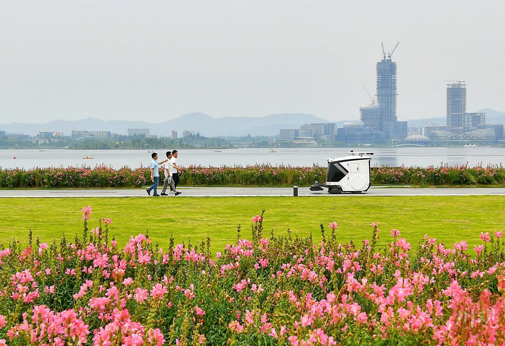 无人驾驶清扫车在成都兴隆湖作业的场景。