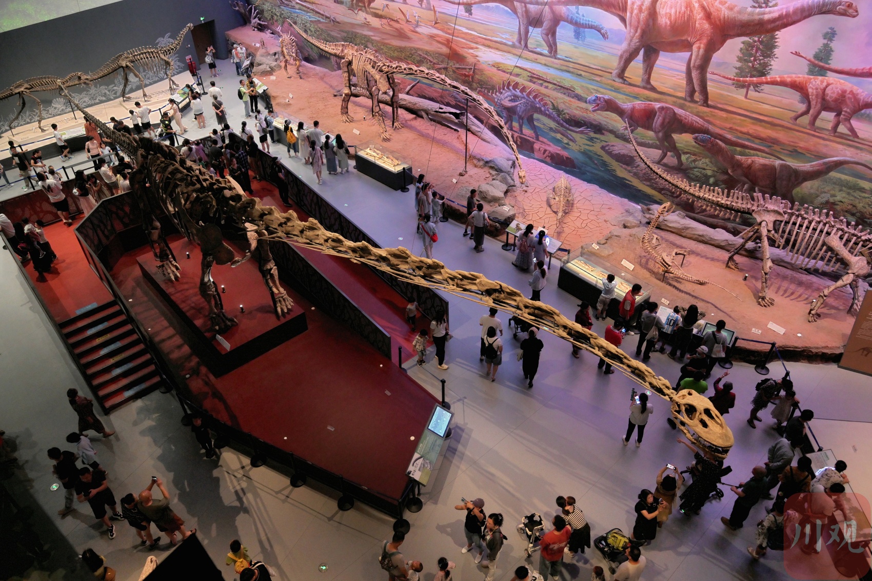 走进馆内,从浩瀚星空到远古深海,仿佛开启了一场时空之旅;展品丰富,从恐龙化石到矿物宝石,四川本地的自然生态沉浸体验。镇馆之宝——身长超20米的合川马门溪龙骨架,位于2楼“龙行川渝厅”,它有着“亚洲完整恐龙化石中的最大者”称号。展厅里,还有众多出现在四川盆地的其他恐龙化石,参观者驻足仰望,好似穿越到了侏罗纪。随处可见讲解员的身影,小朋友们围着转,大人也听得入迷。