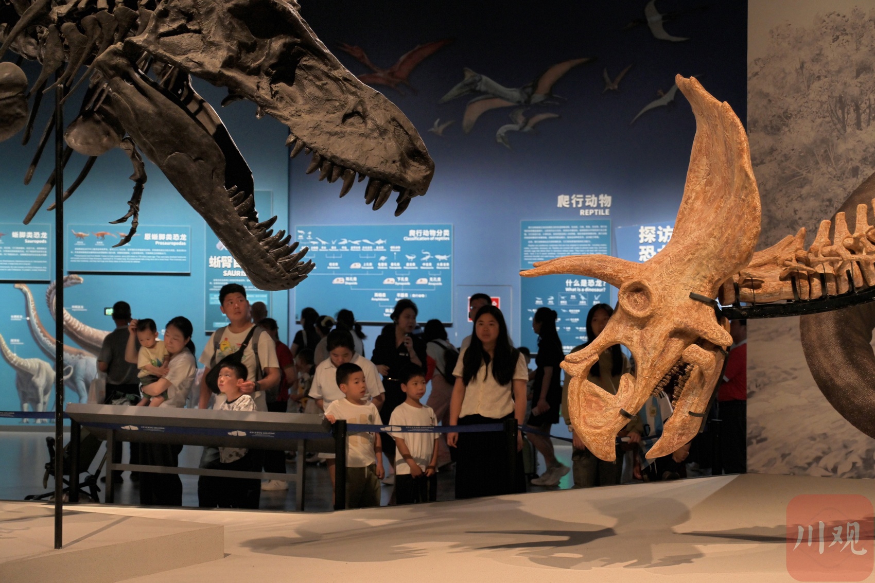 “大小朋友”驻足观看霸王龙与三角龙的“对决”。
