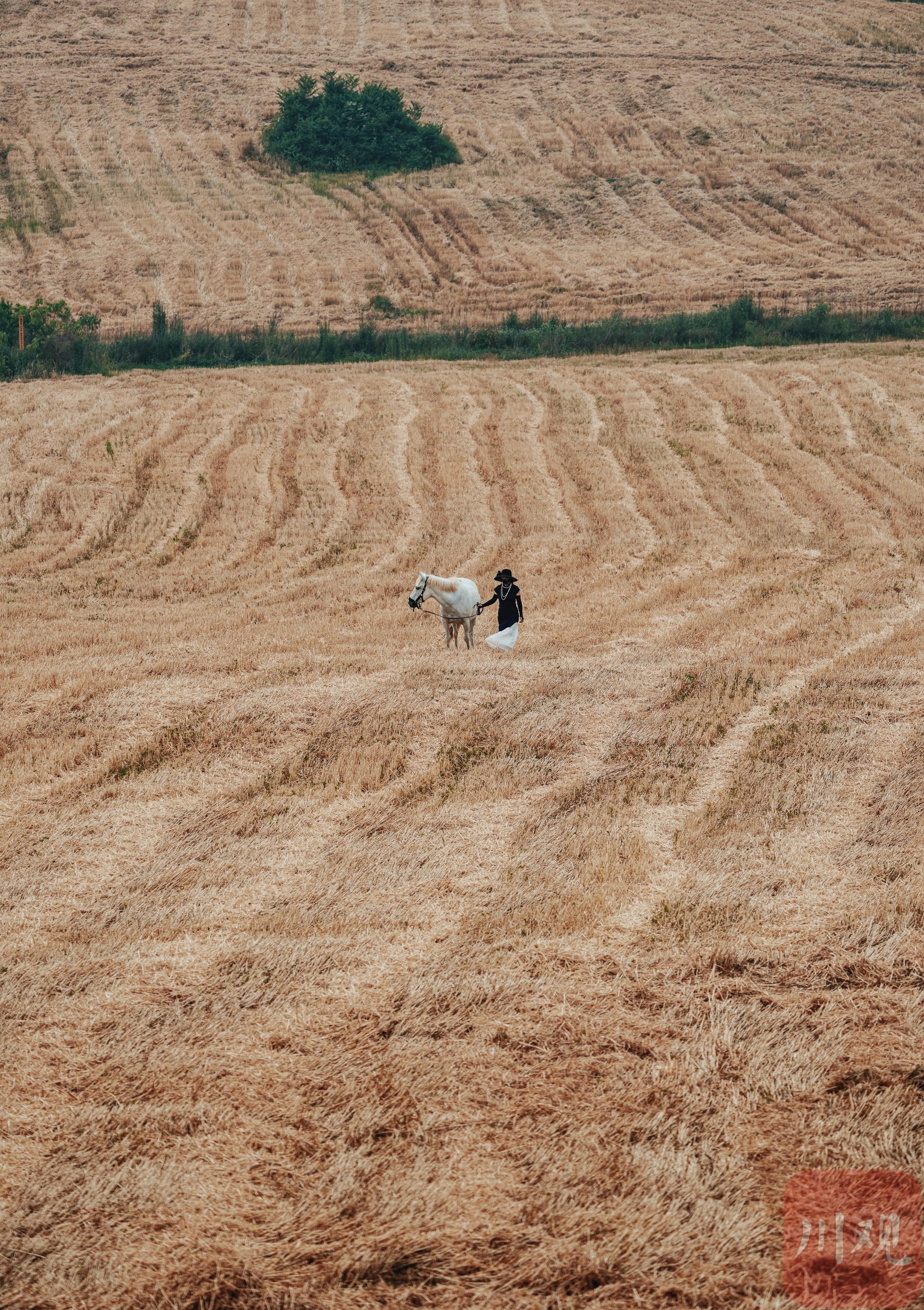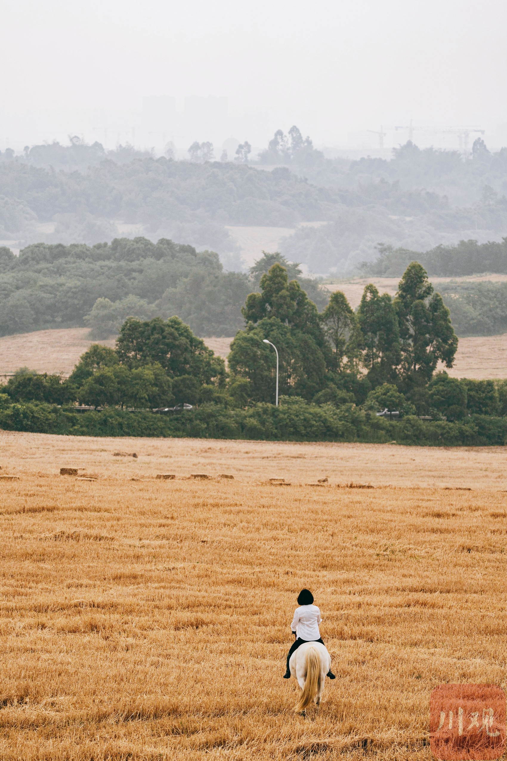 5月21日,正值小满节气,成都市双流区牧马山上一派诗意景象。收割后的麦茬地绵延起伏,马匹悠然穿行其间,与远处的城市相映成趣。这里曾是三国时期蜀汉的军马养殖地。