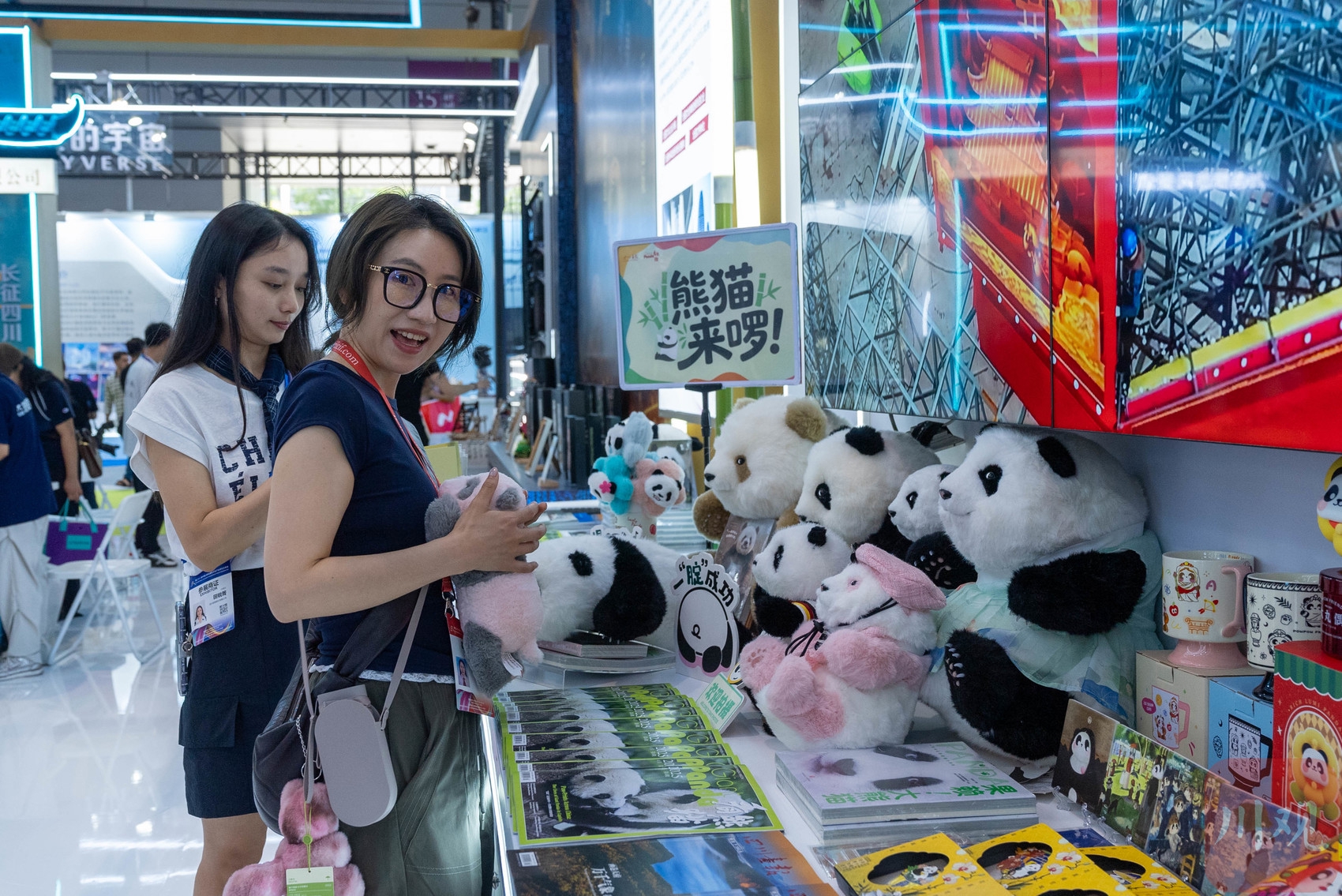 观众在四川新华出版发行集团熊猫书店展台抚摸熊猫毛绒玩具。