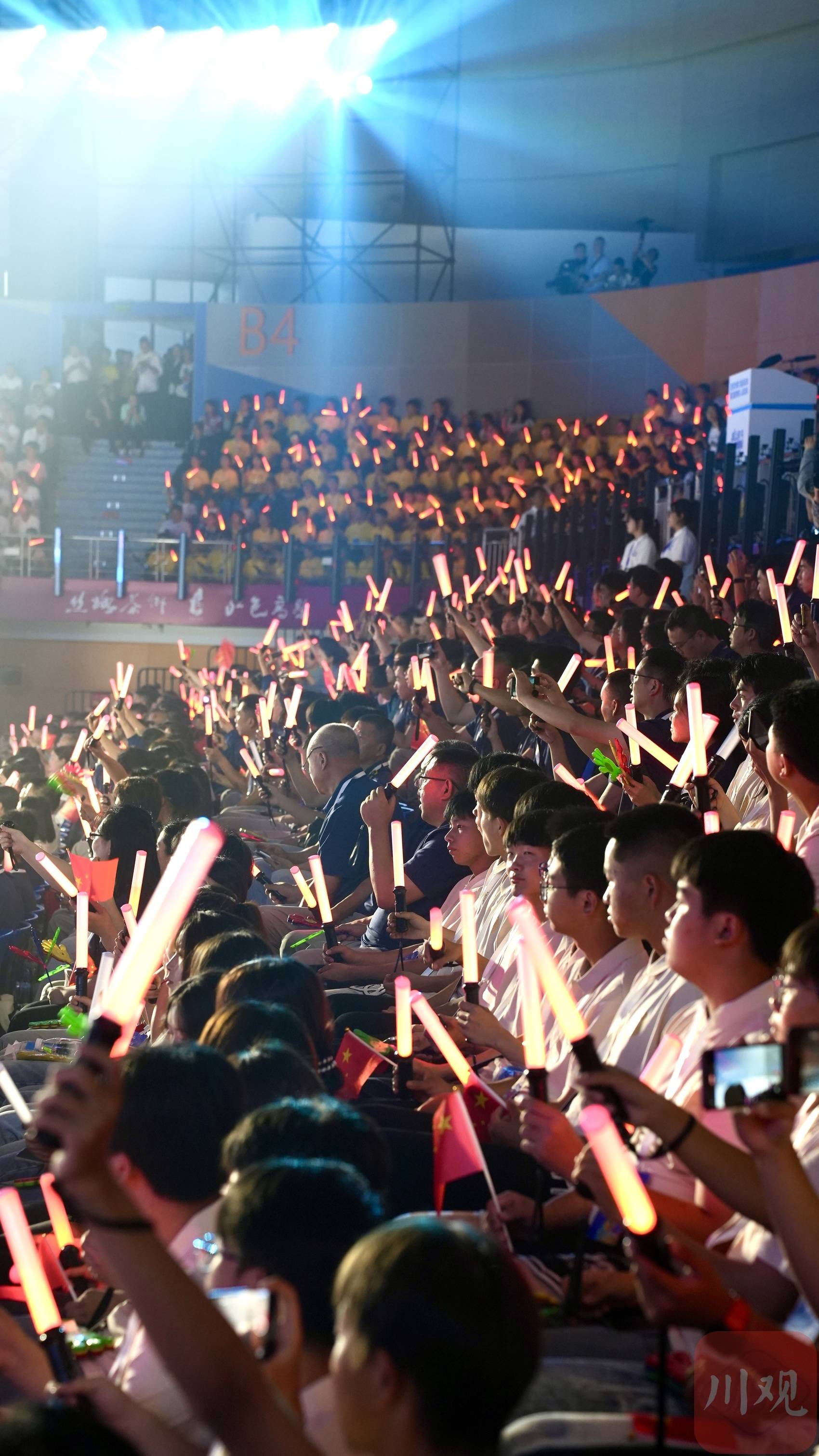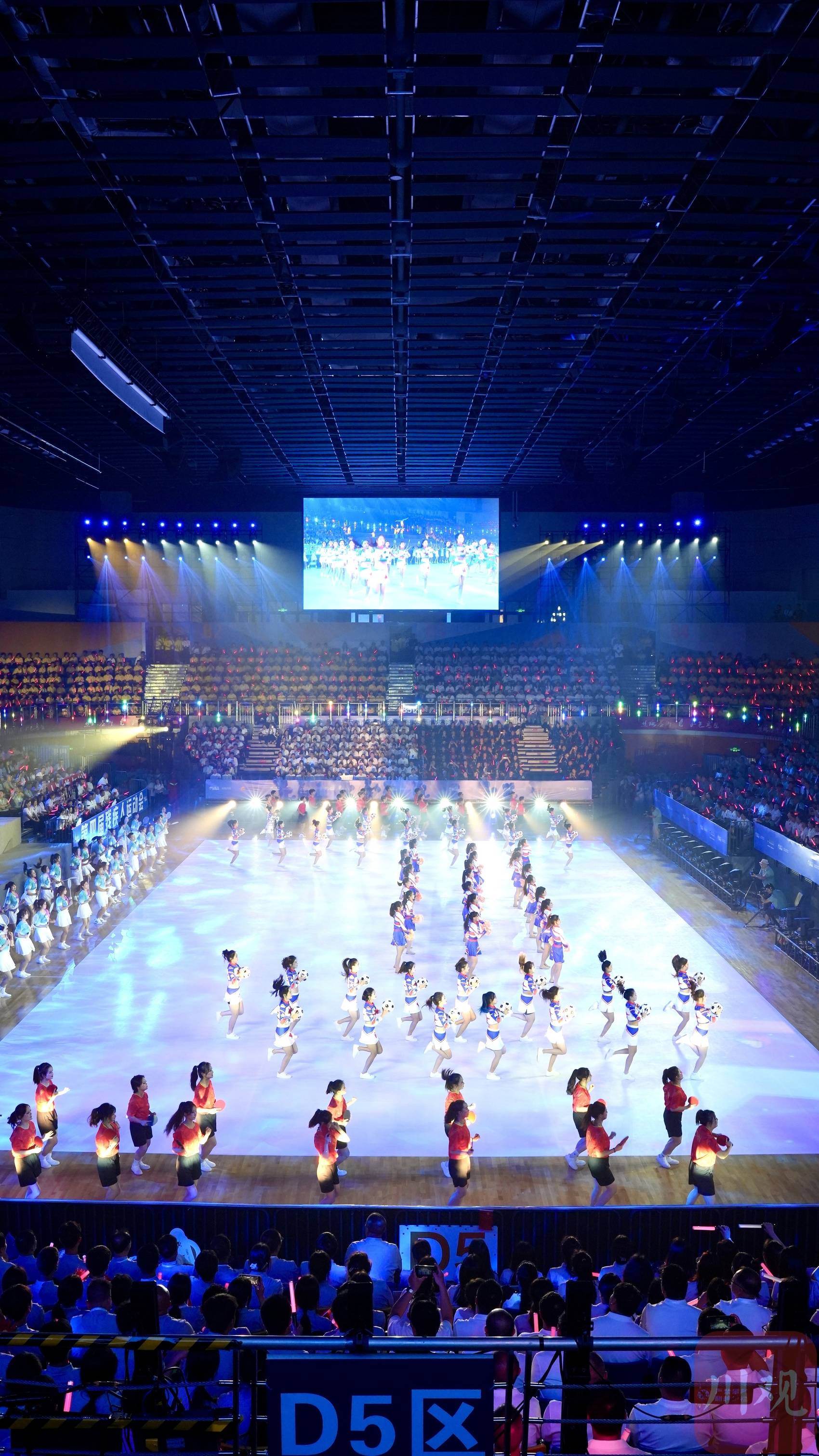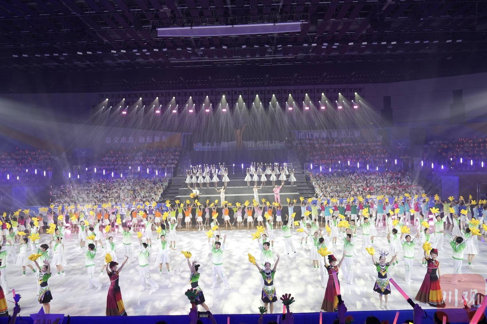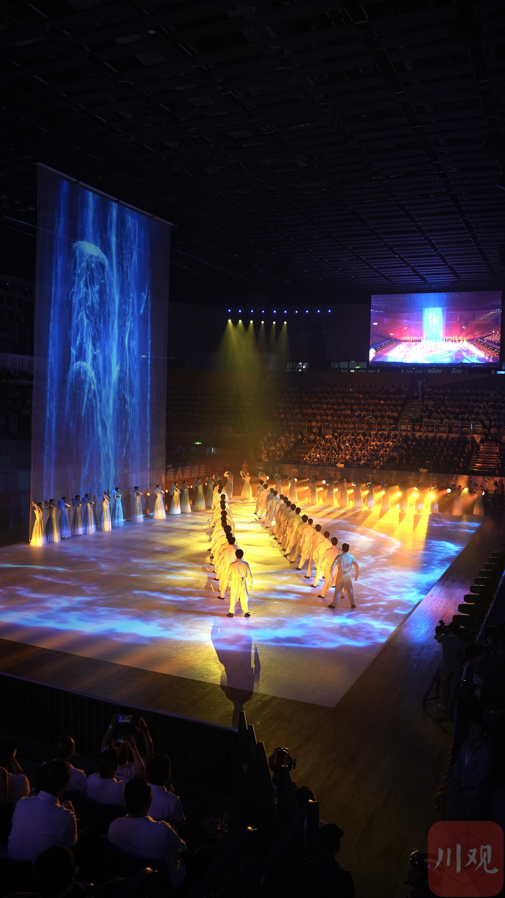 开幕式现场,“美人鱼”舞者和饰演“白鹭”的杂技演员,描绘出“鸟翔鱼跃、水天一色”的生态画卷;在第二篇章中,演员们化身博弈主角,巧妙融合体育精神与青春力量,书写新时代宜宾“勇立潮头”的激昂篇章;终章以童声《星辰大海》点亮星河舞台,100名演员组成“奥运五环”方阵载歌载舞。