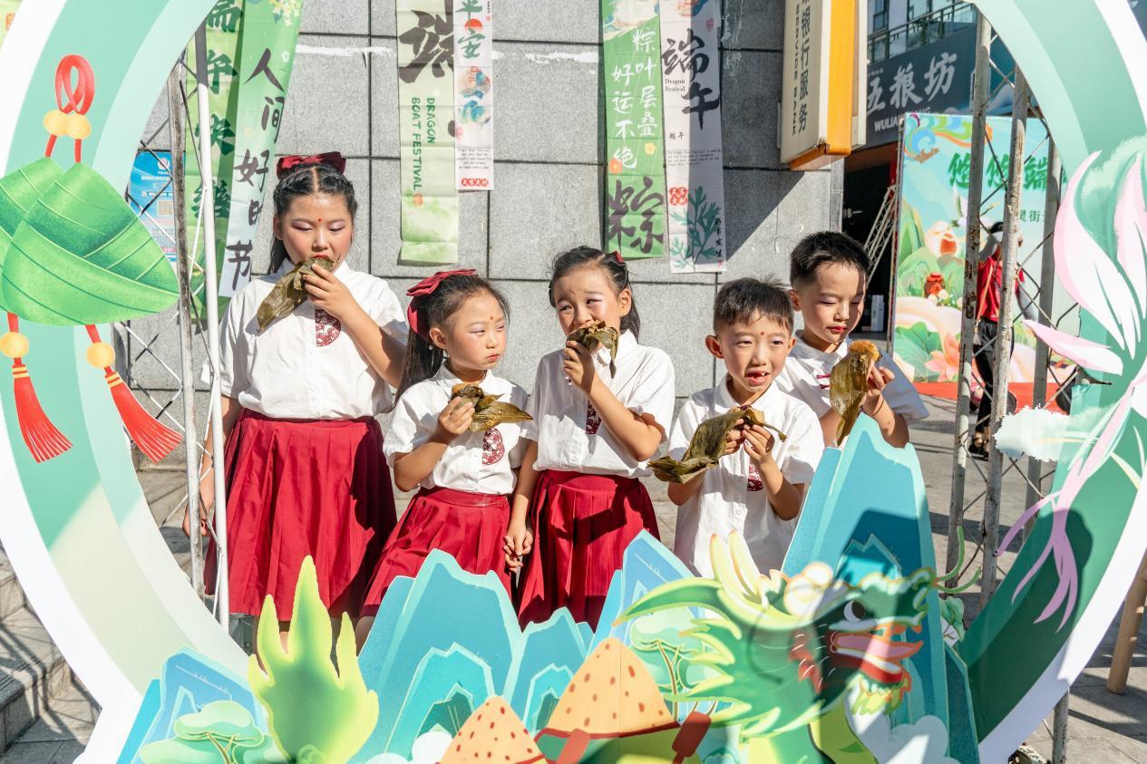 与此同时,在南街社区“安康工坊”内,20位居民用彩布缝制200余个中草药香囊;在新西街社区的“汉服诵经典”活动中,12名儿童吟诵《离骚》选段;在城东路社区,由“五老”志愿者开设的“端午故事会”正在开讲……