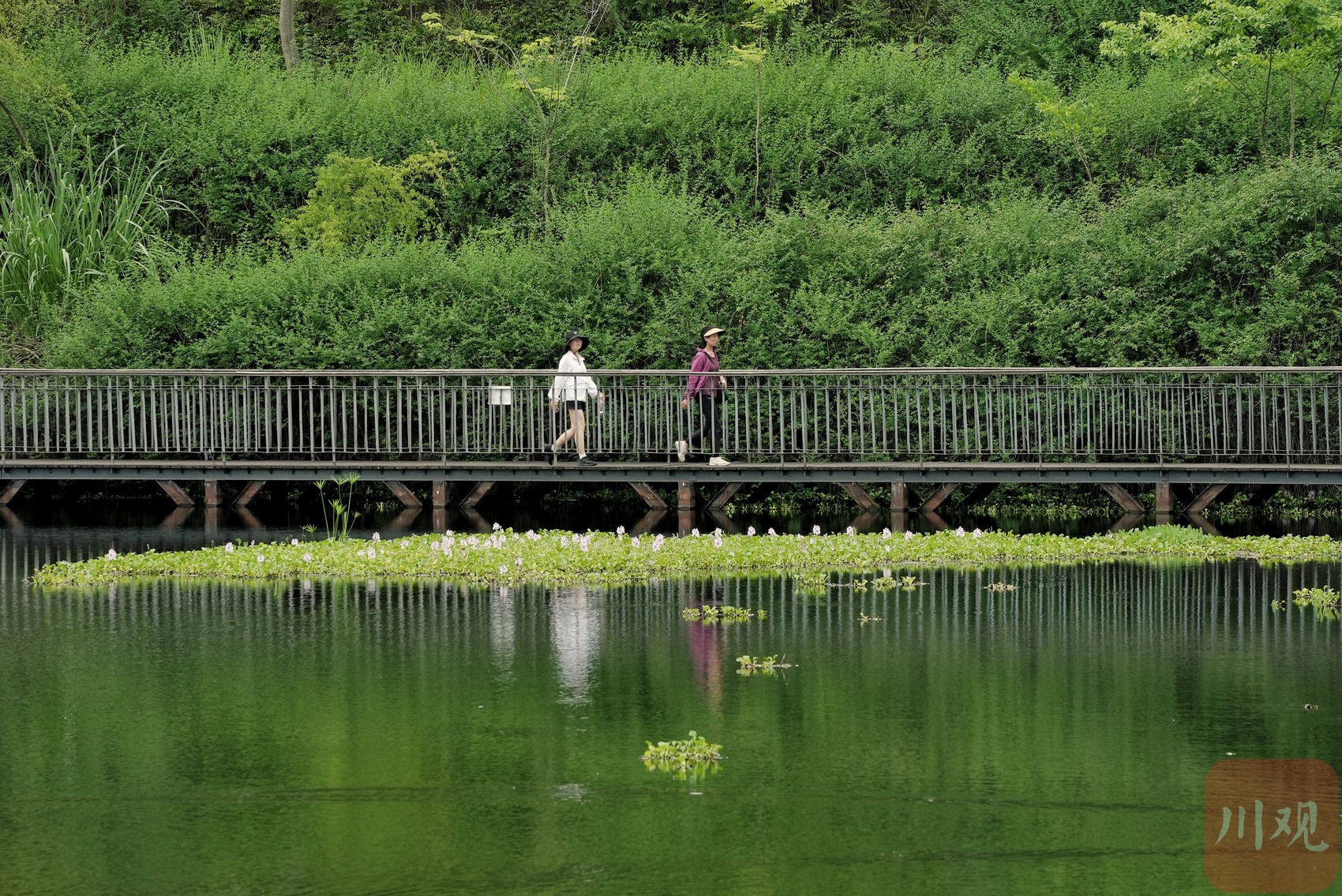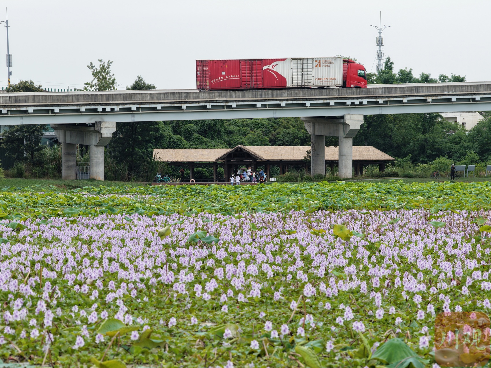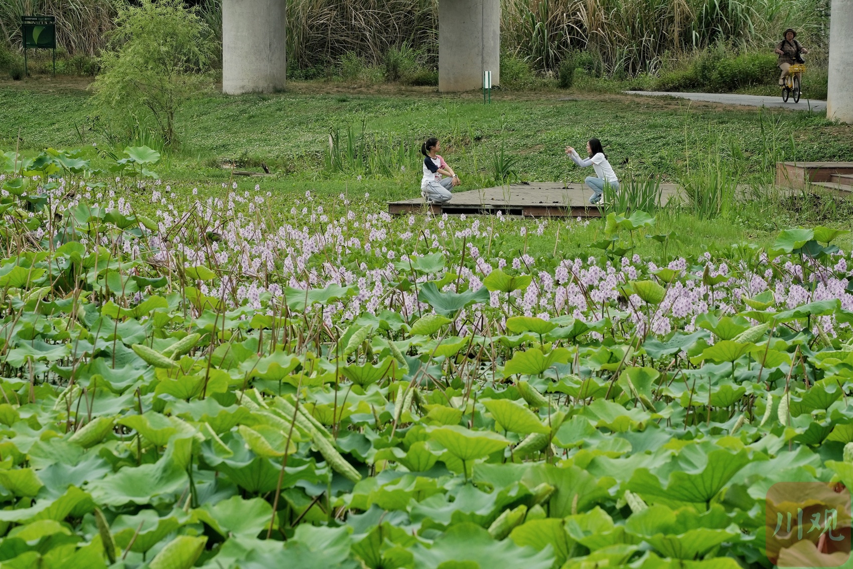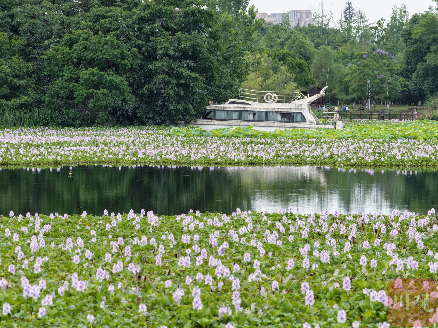 市民沿着木栈道前行,便能邂逅这片令人惊艳的水葫芦花海。