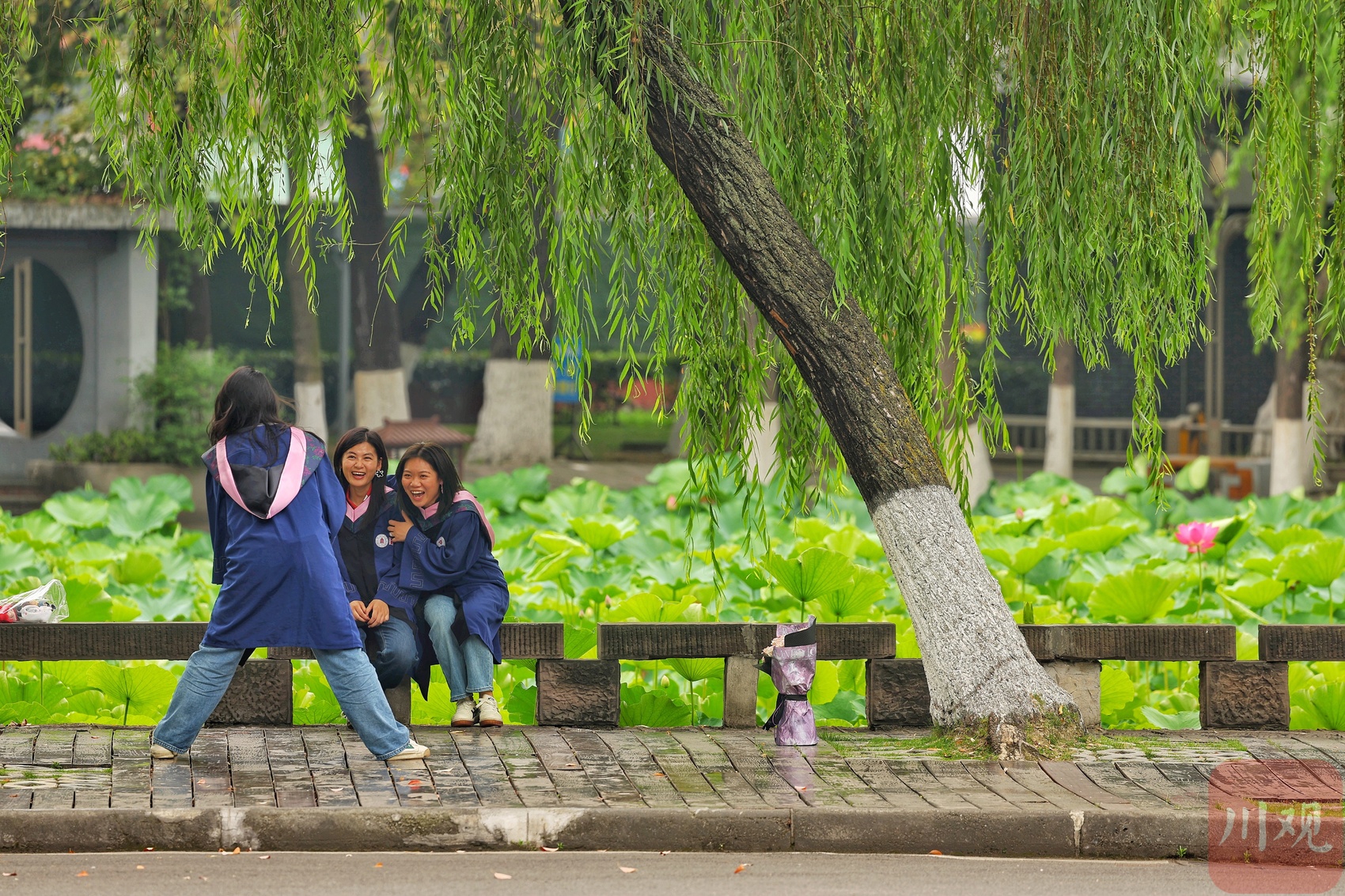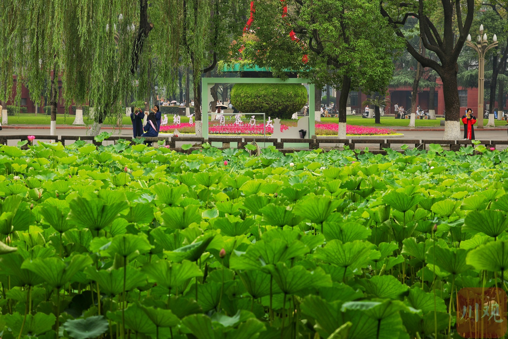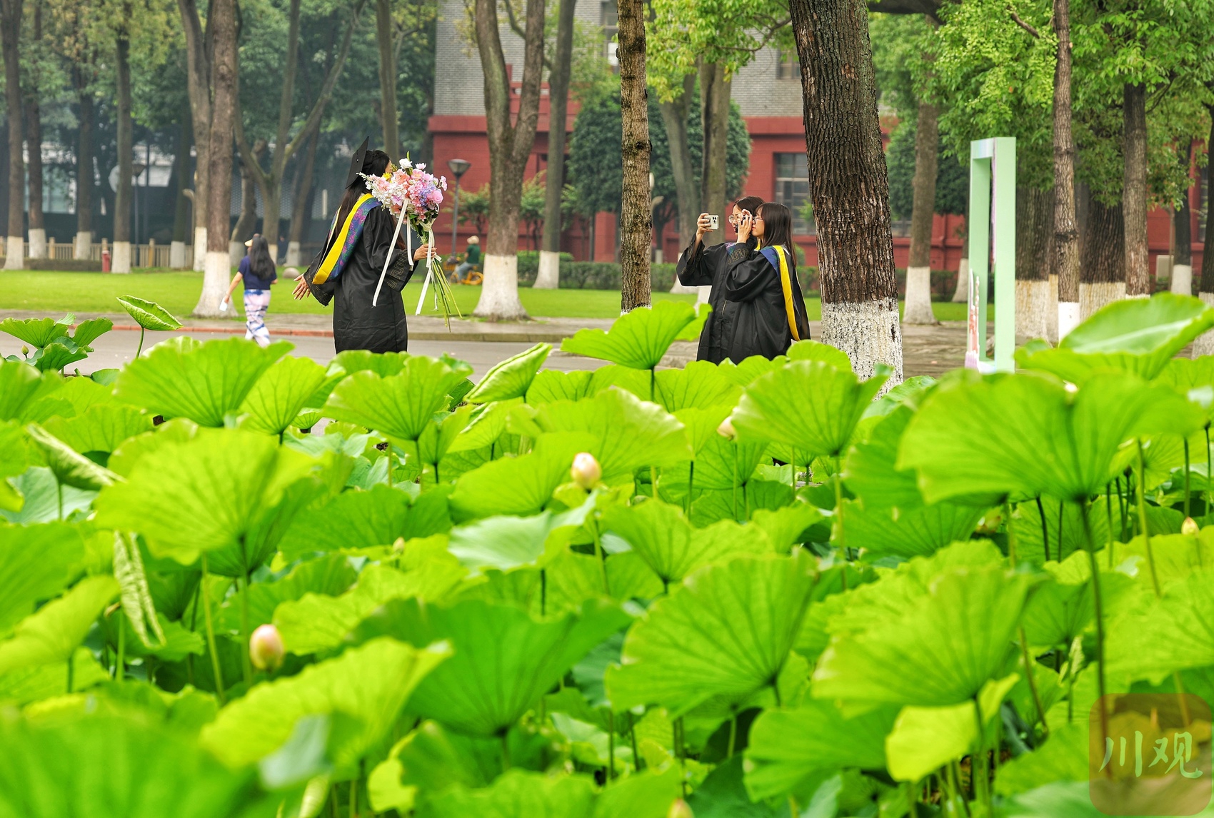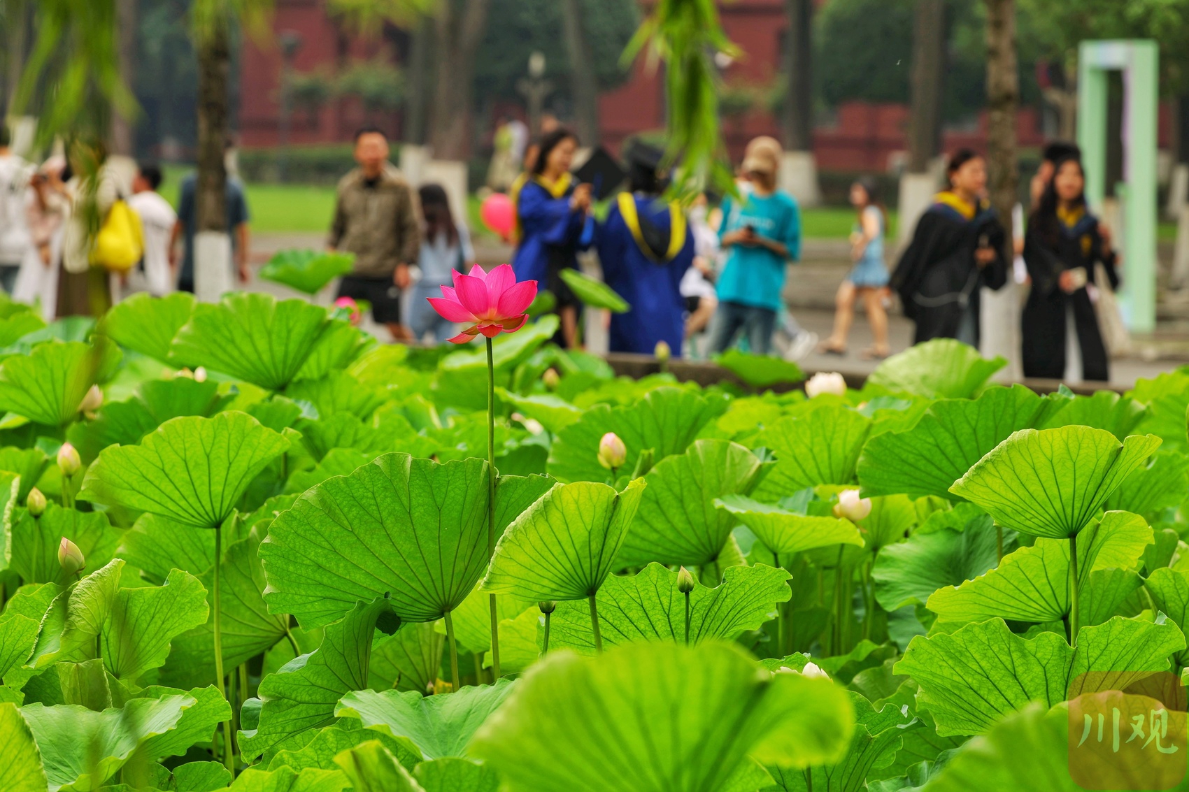 六月初夏,四川大学望江校区的荷花池夏风轻浮、荷香柳浪,盎然生机的画卷让不少市民和学子如期赴约。6月6日正值毕业季,身着学士服的学子以荷为幕、以柳为帘,在镜头前绽放笑颜。树影斑驳间,快门的轻响与欢笑声交织,将少年意气定格成永恒。望江校区大门左右的荷花池承载着数代川大人的记忆,现已是校园地标和市民赏荷之地。