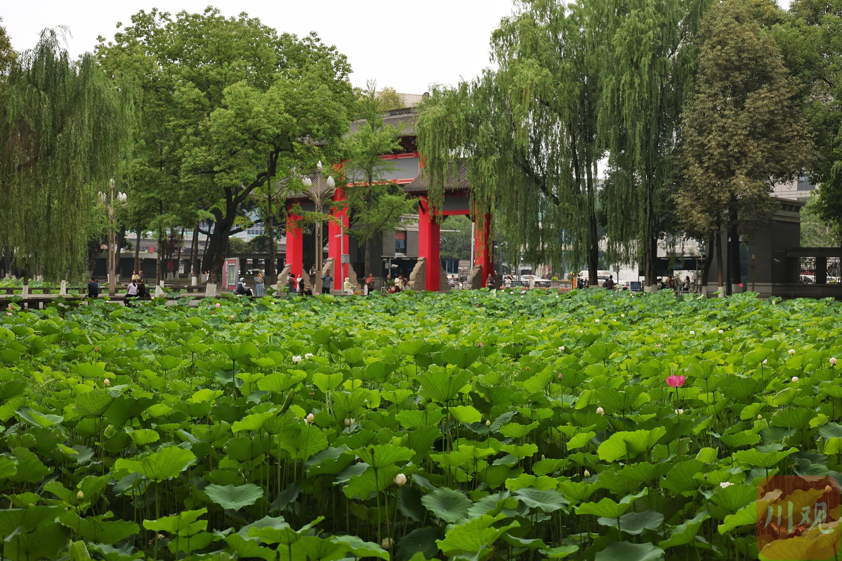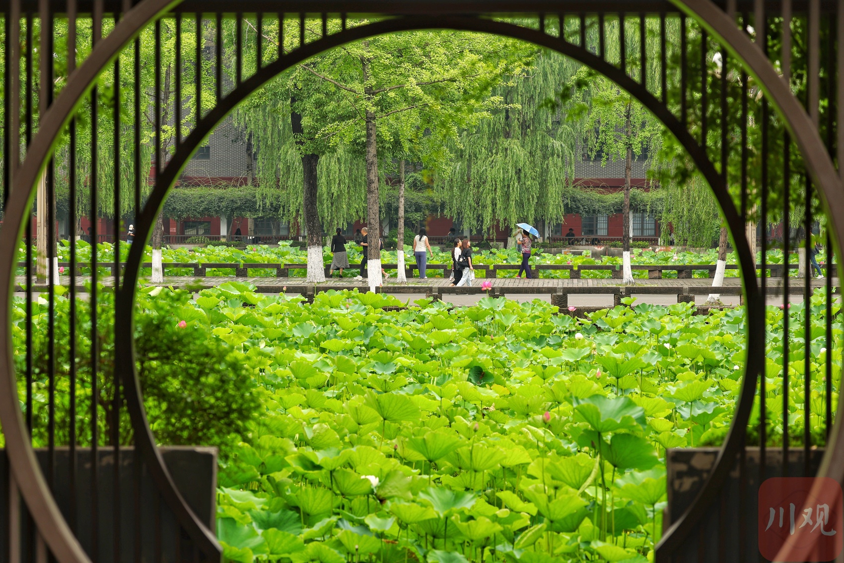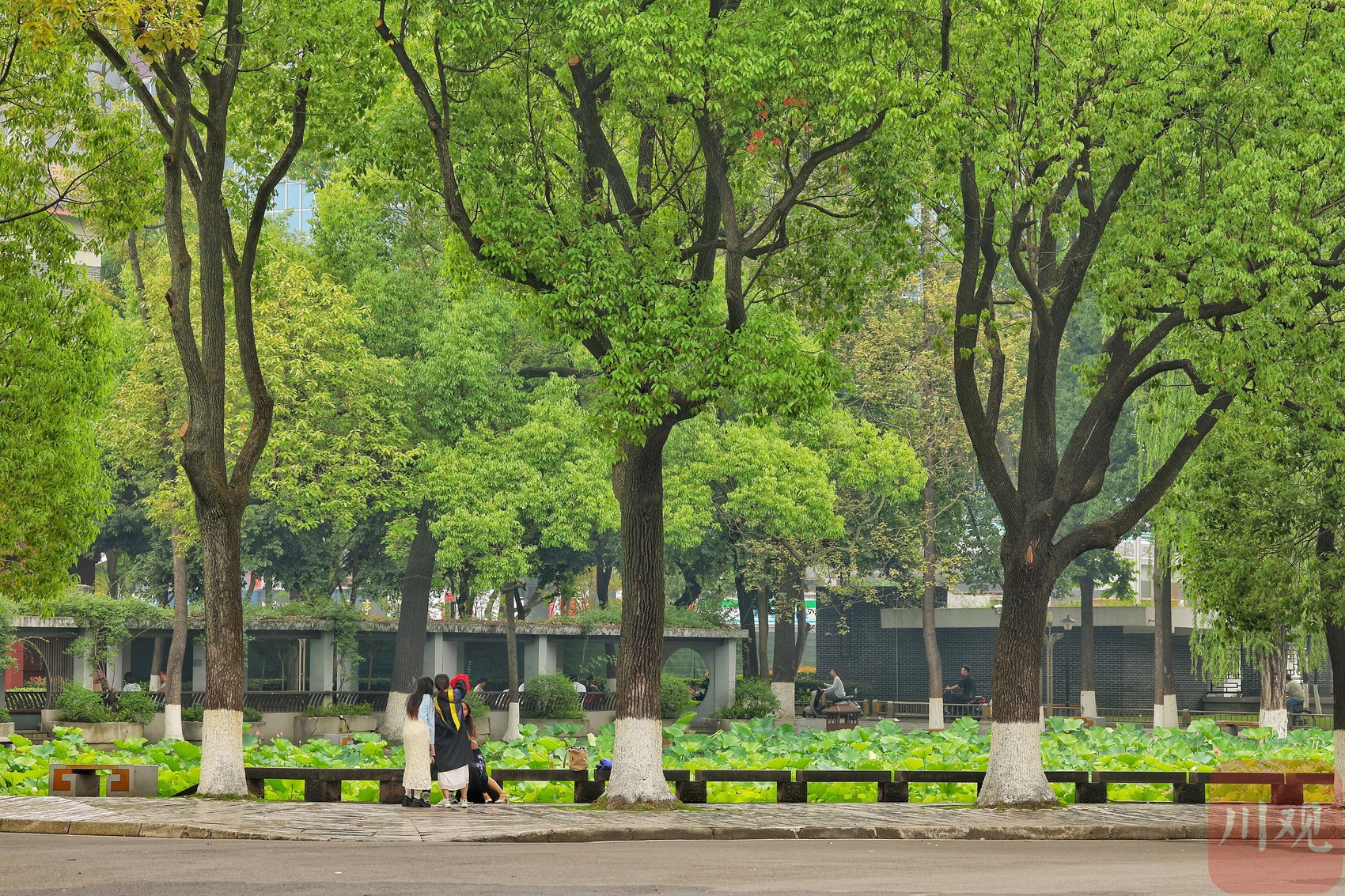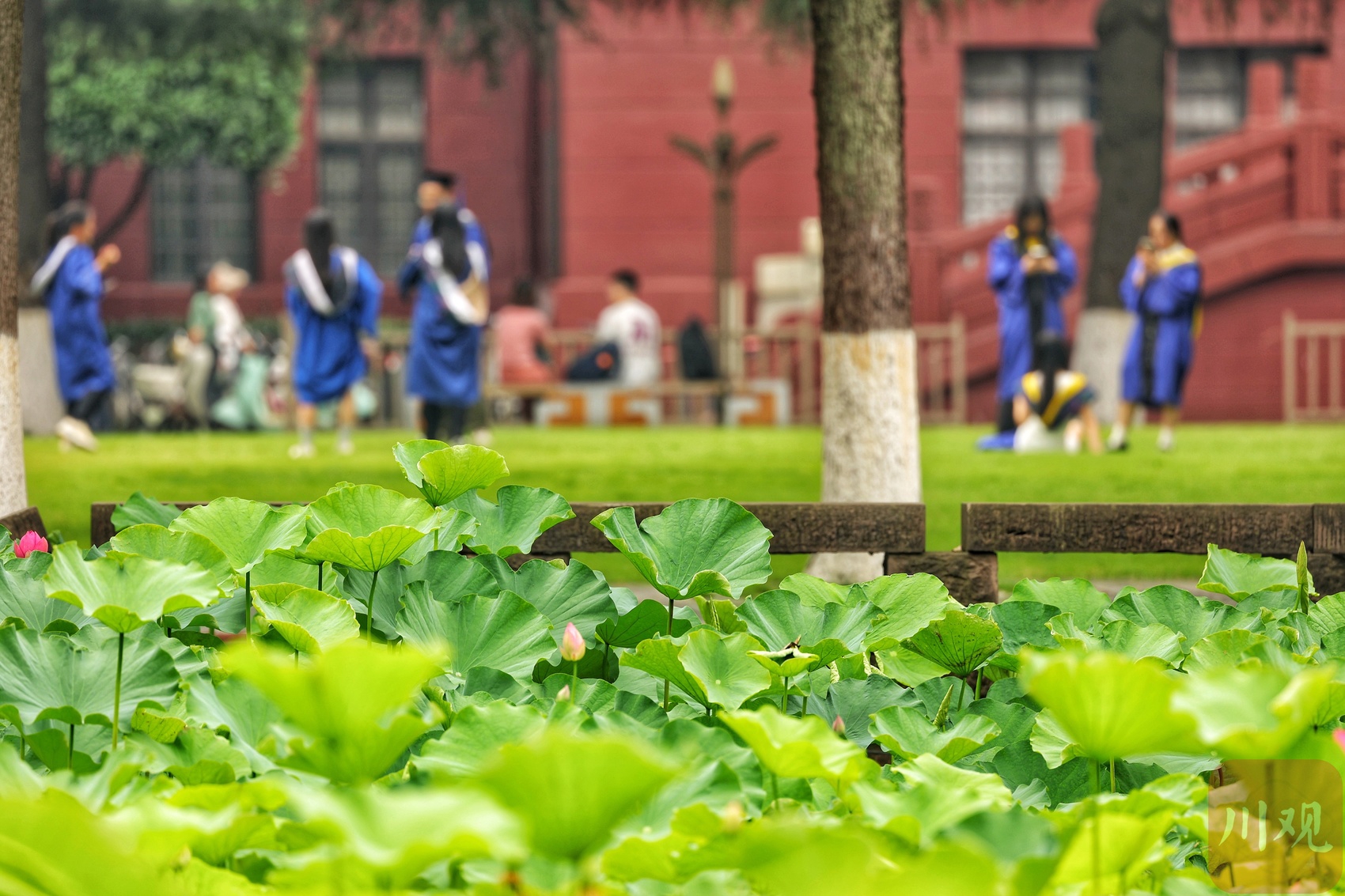 六月初夏,四川大学望江校区的荷花池夏风轻浮、荷香柳浪,盎然生机的画卷让不少市民和学子如期赴约。6月6日正值毕业季,身着学士服的学子以荷为幕、以柳为帘,在镜头前绽放笑颜。树影斑驳间,快门的轻响与欢笑声交织,将少年意气定格成永恒。望江校区大门左右的荷花池承载着数代川大人的记忆,现已是校园地标和市民赏荷之地。