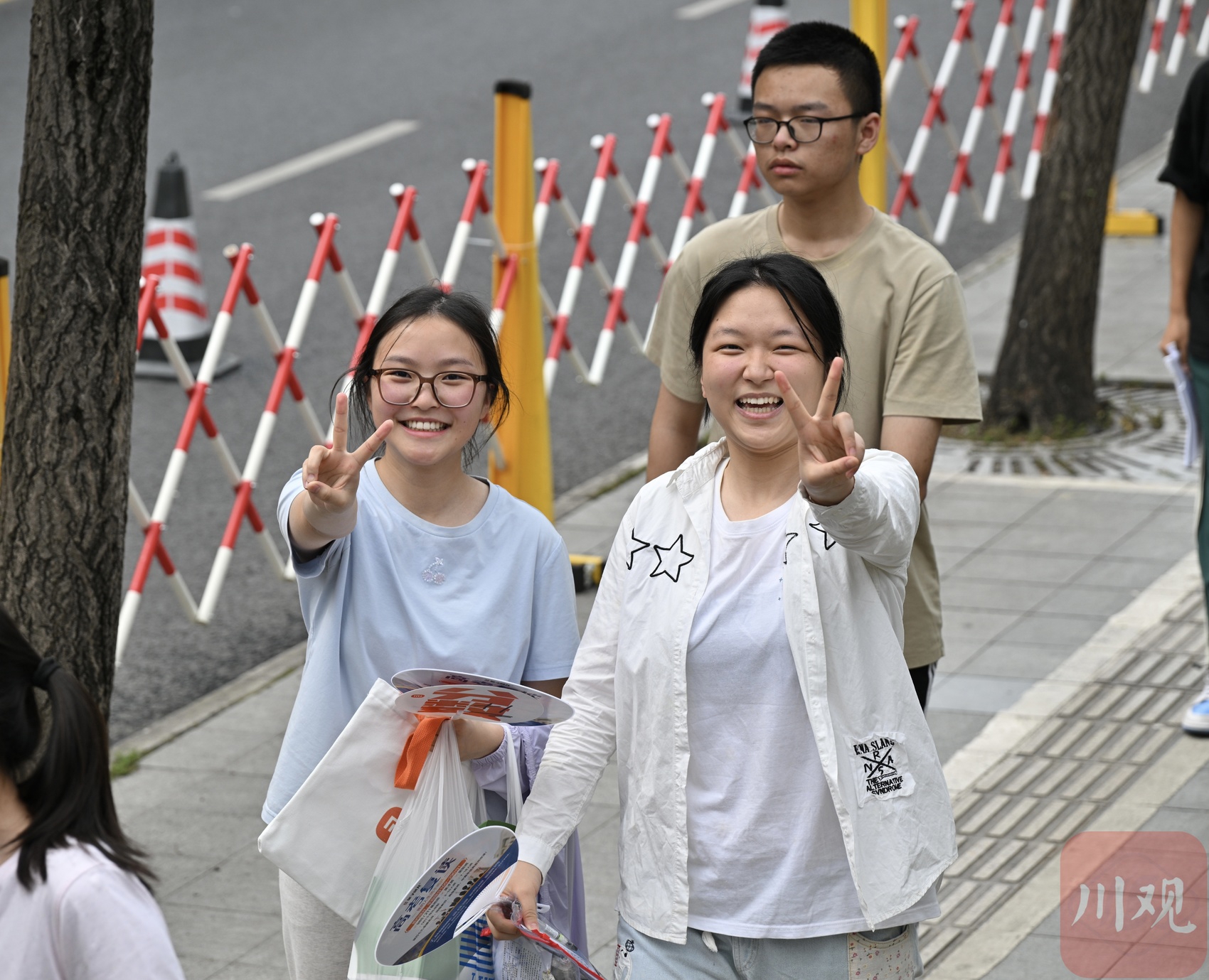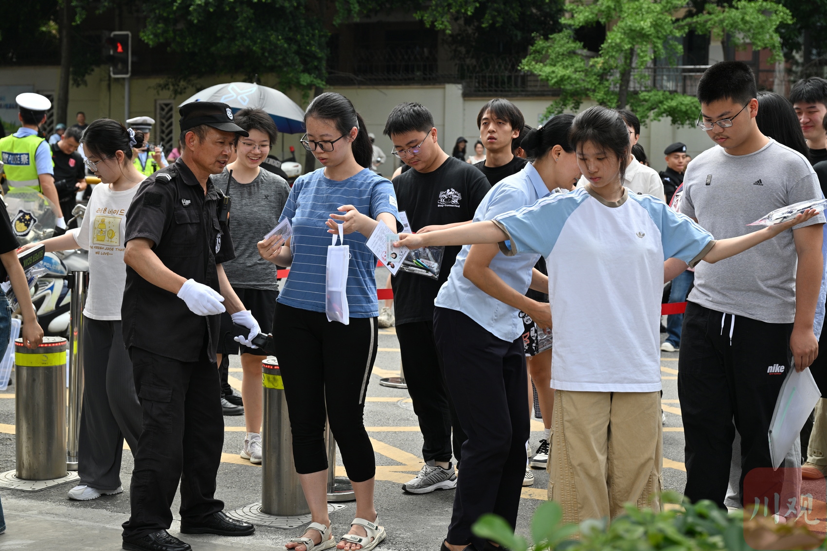 四川师大附中考点外,考生们有序接受安检进场。