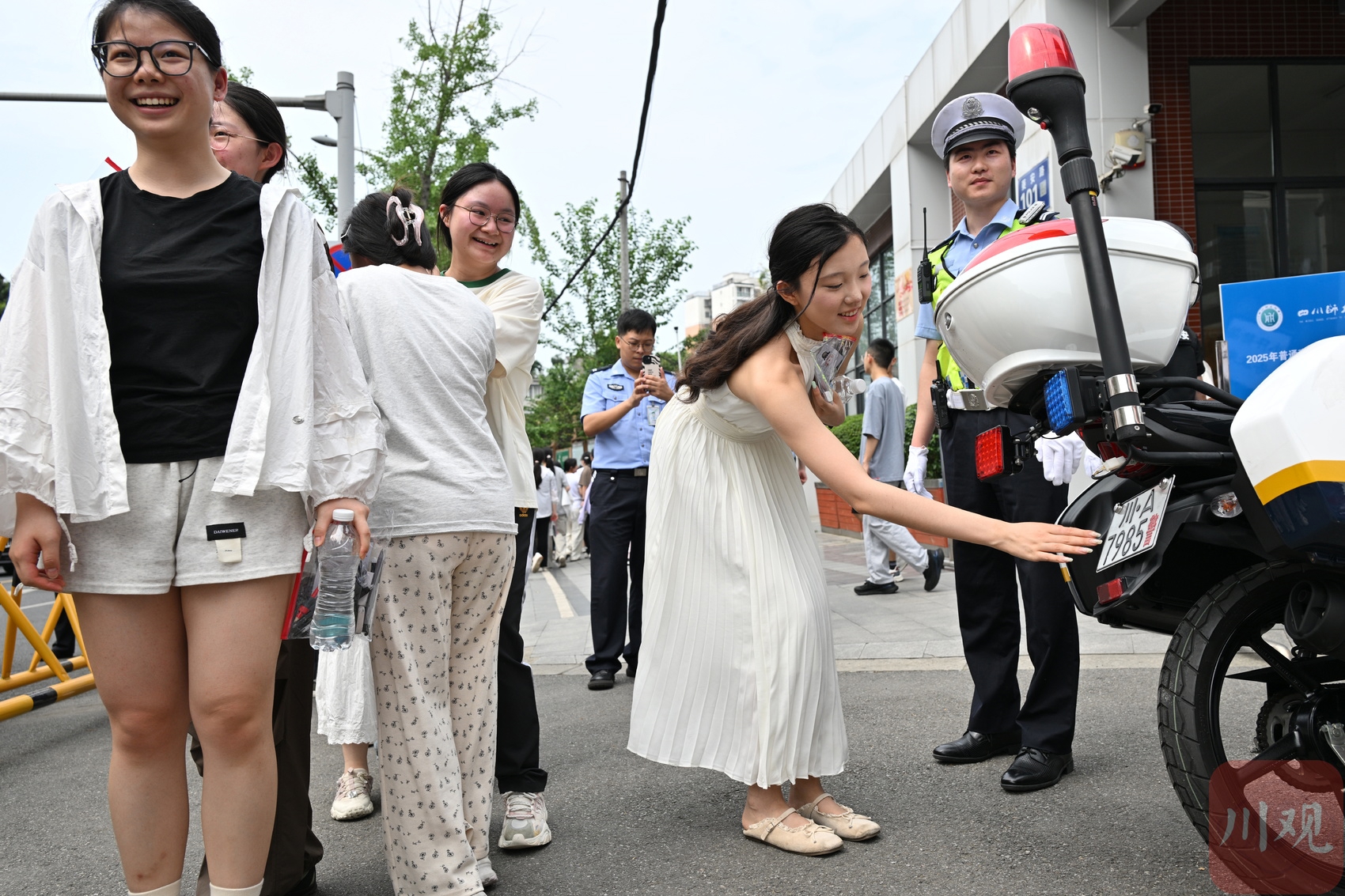 一名考生用手触摸车牌尾号为985的警车,祝福自己取得好成绩。