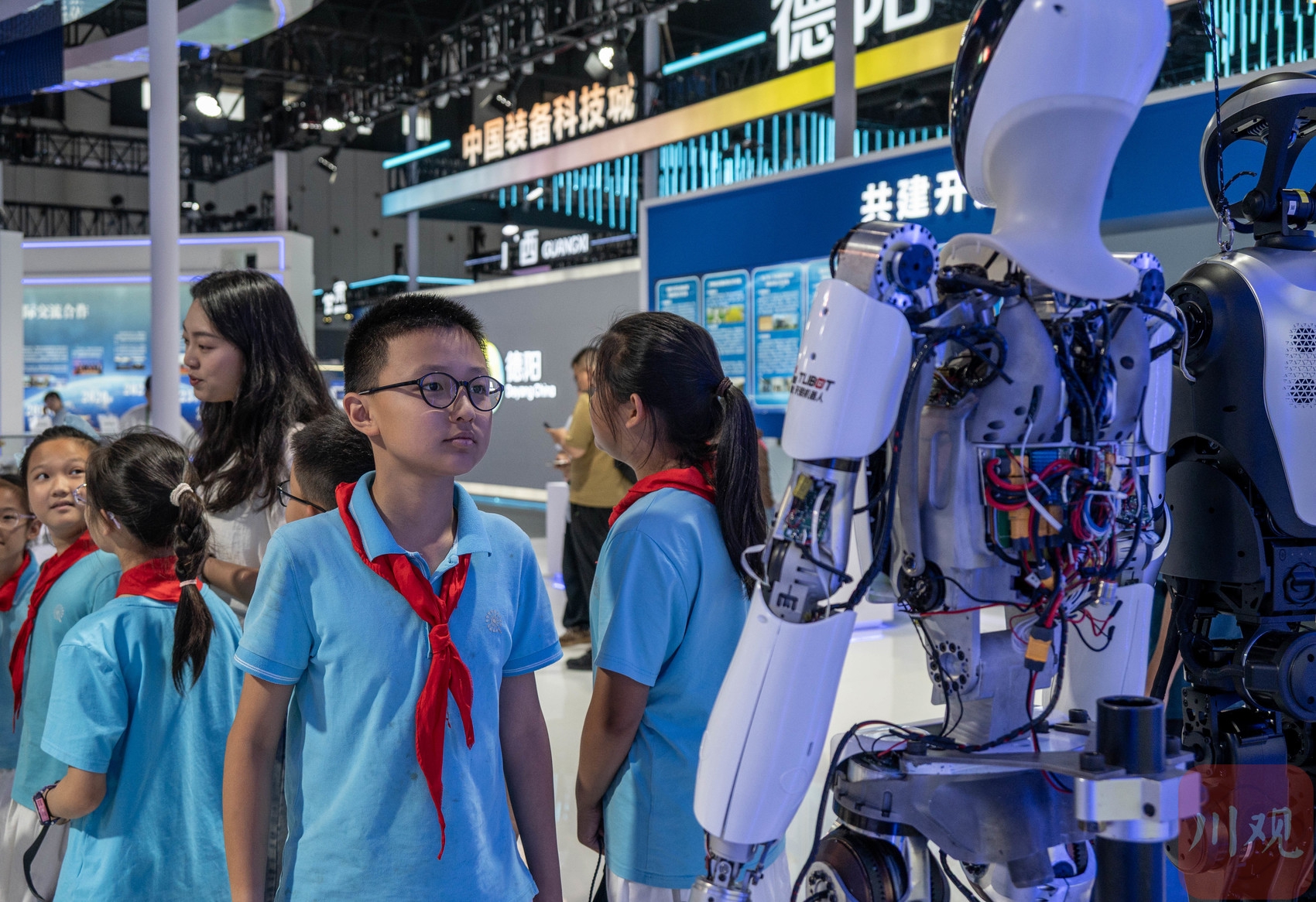 参观的学生对人形机器人发生了兴趣。