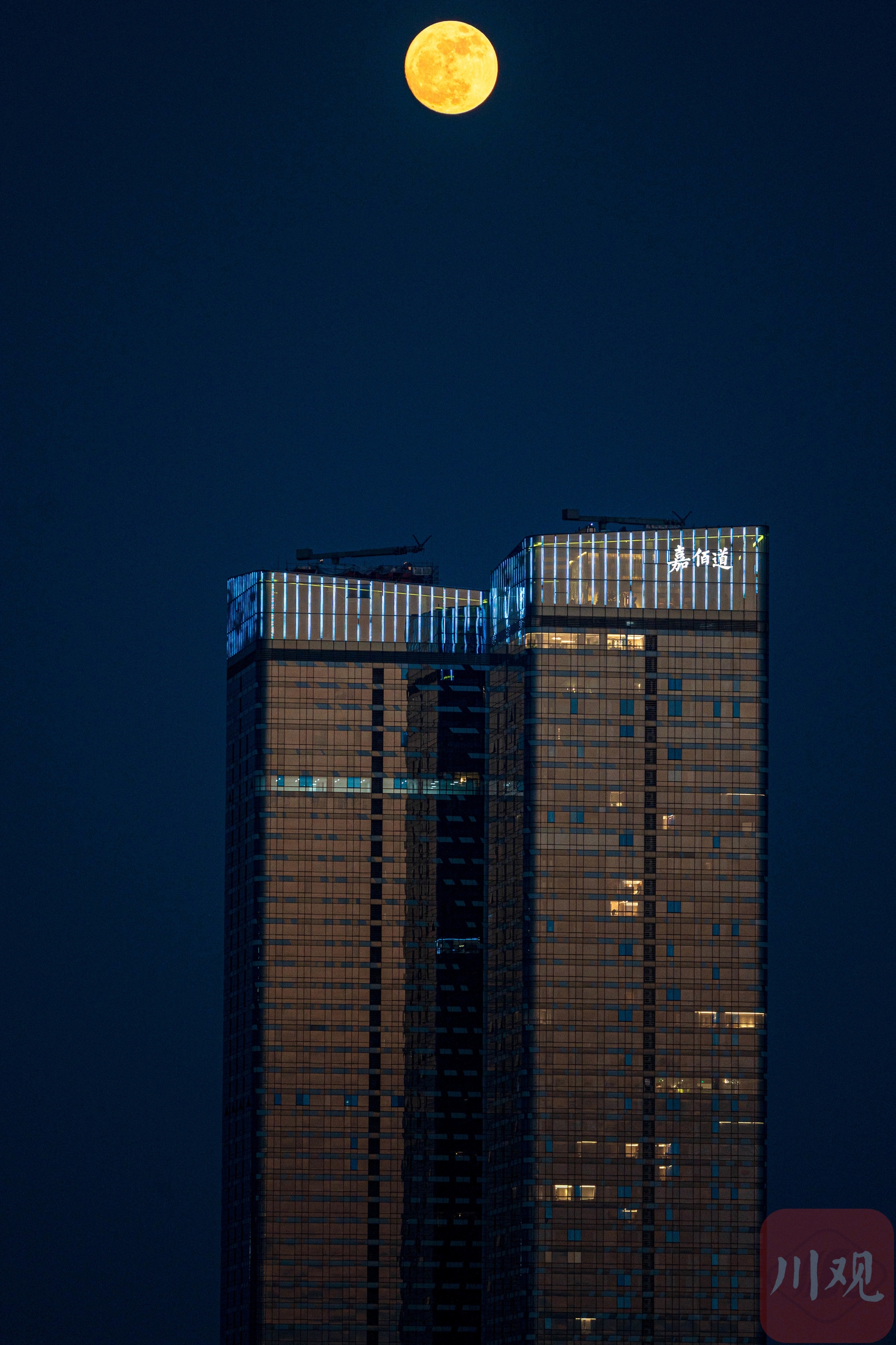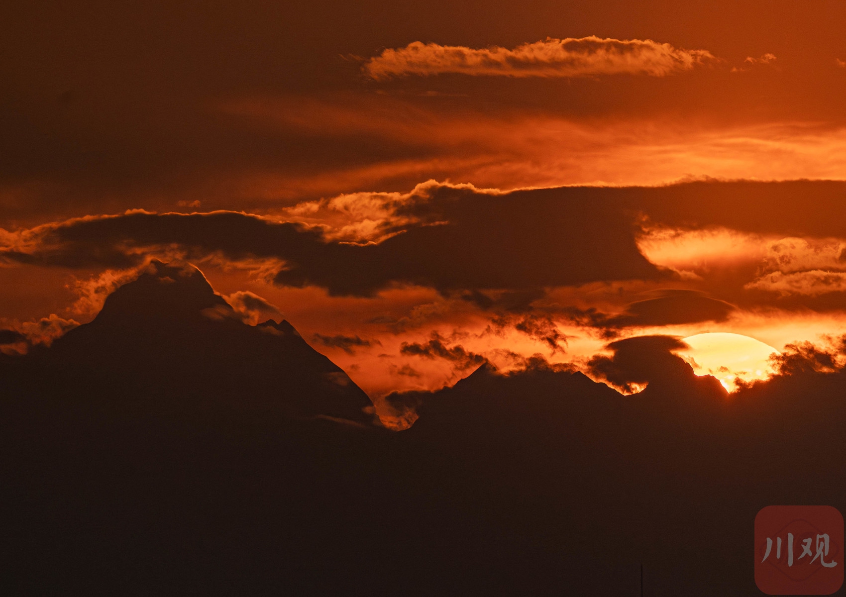 6月10日傍晚,成都西边的群山在日落时分清晰可见,太阳于100公里外的幺妹峰附近缓缓落下。与此同时,一轮圆月悄然升起在东边天空,悬于城市上空,将暮色中的美景推向高潮。