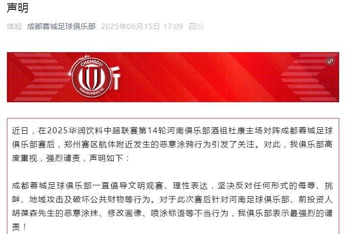 成都蓉城足球俱乐部一直倡导文明观赛、理性表达,坚决反对任何形式的侮辱、挑衅、地域攻击及破坏公共财物等行为。对于此次赛后针对河南足球俱乐部、前投资人胡葆森先生的恶意涂抹、修改画像、喷涂标语等不当行为,我俱乐部表示最强烈的谴责!