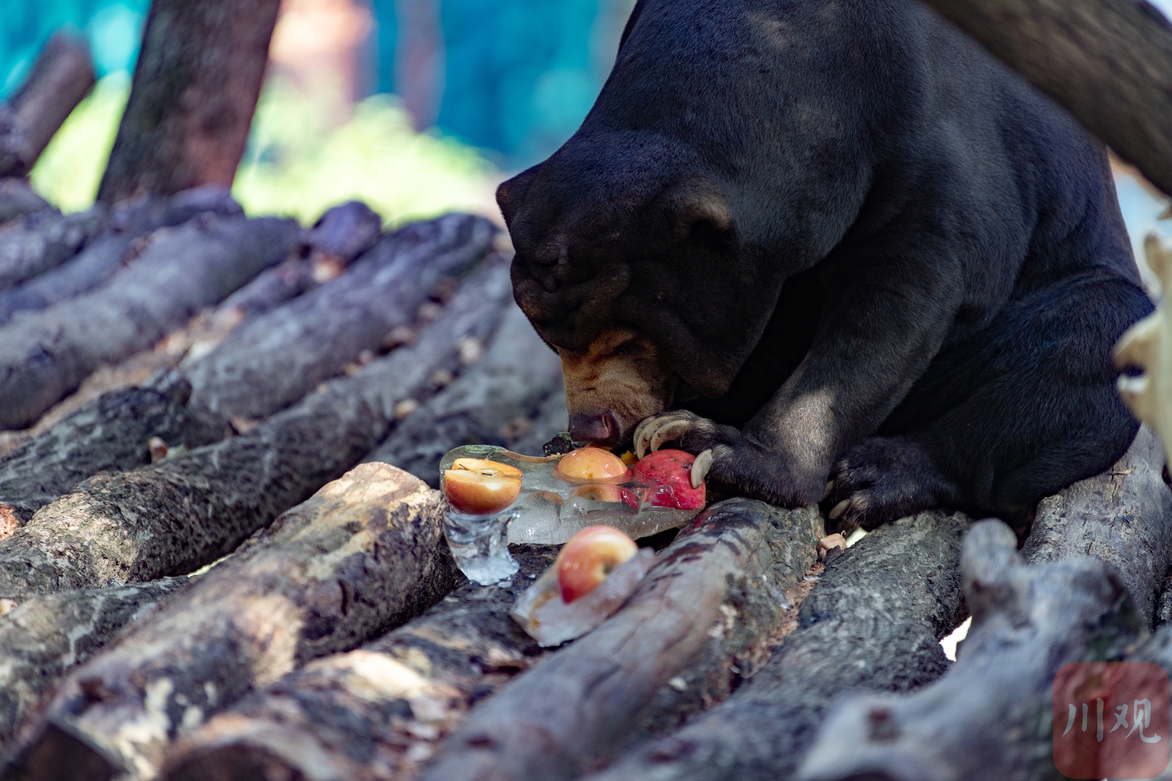 6月16日,马来熊在成都动物园吃冰冻果盘。