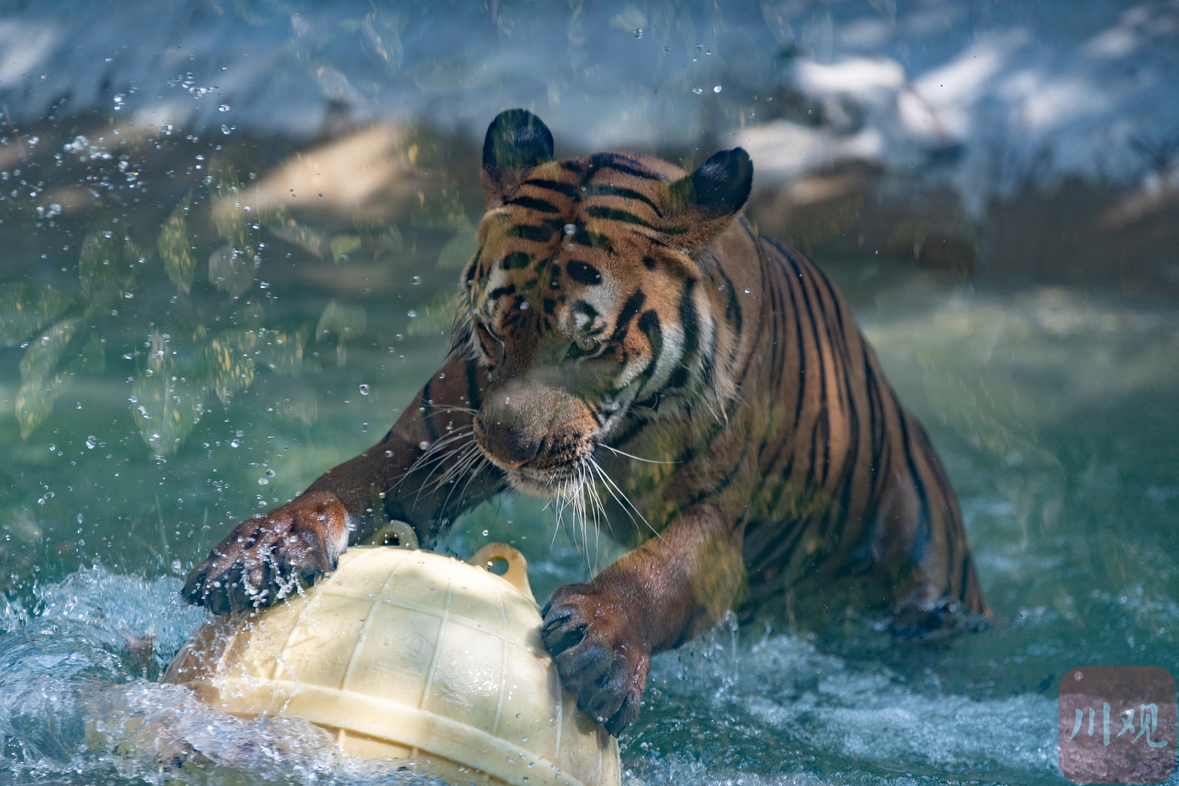 6月16日,华南虎在成都动物园的水池中玩水。