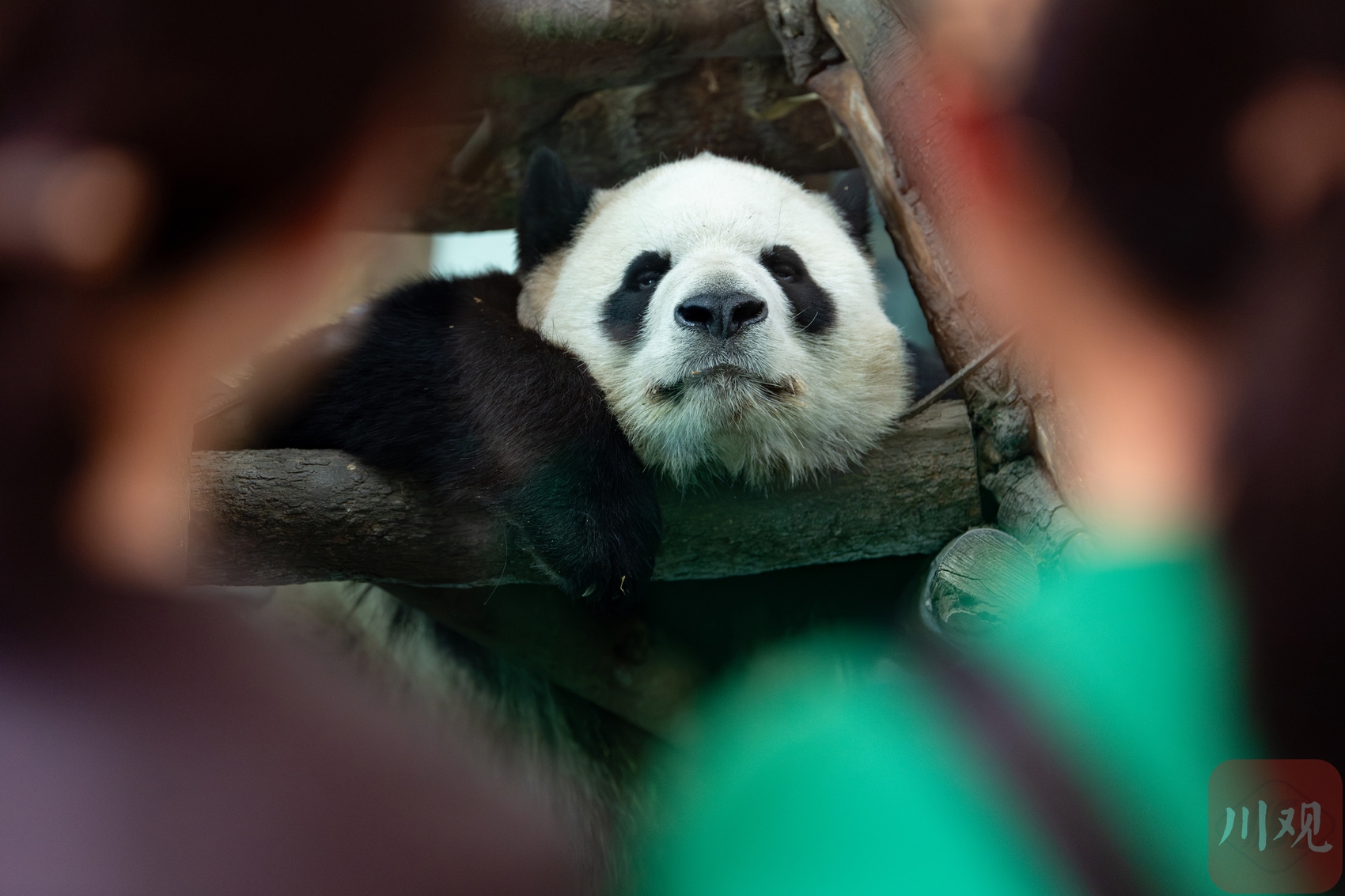 6月16日,大熊猫在成都动物园乘凉。
