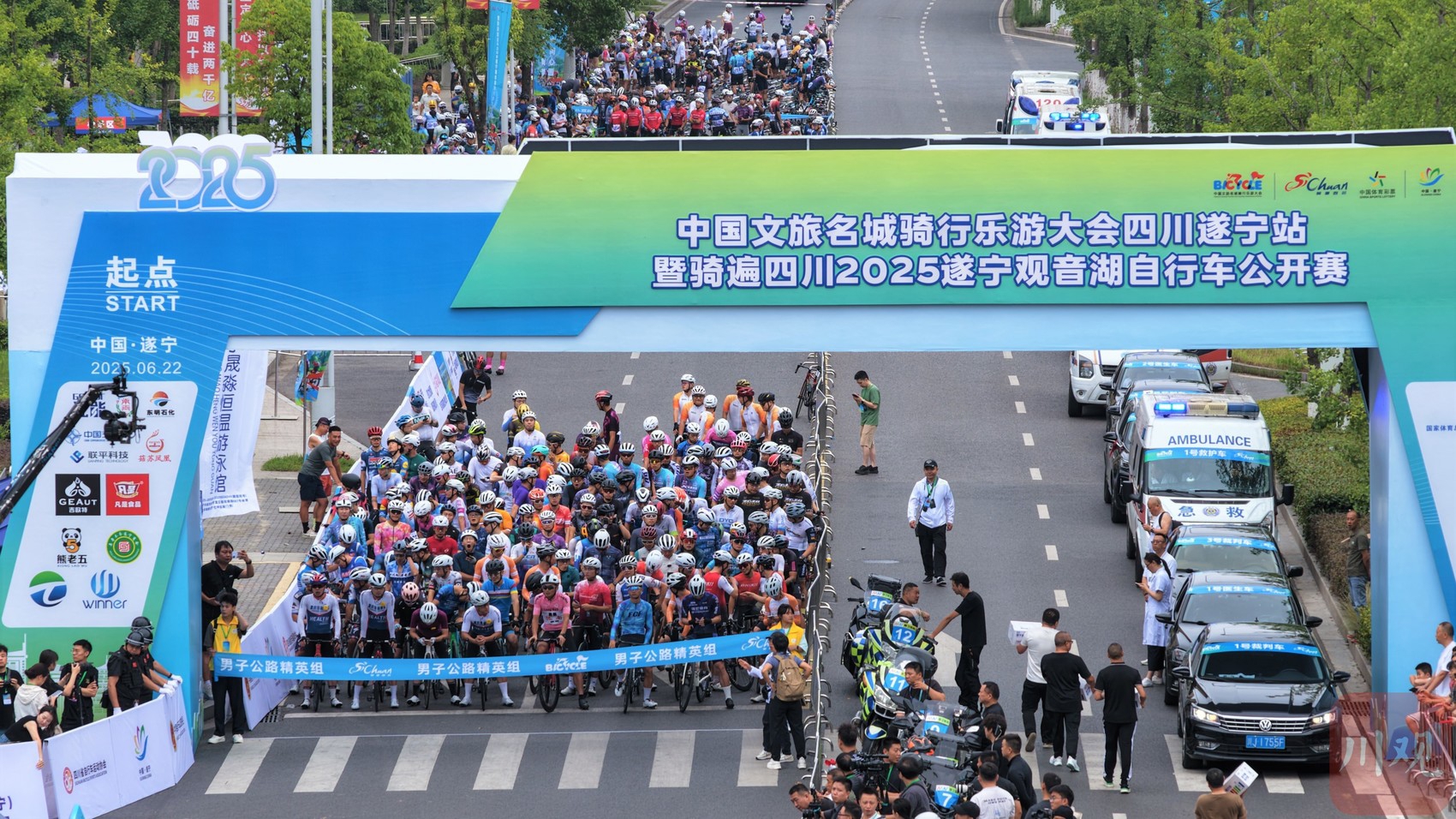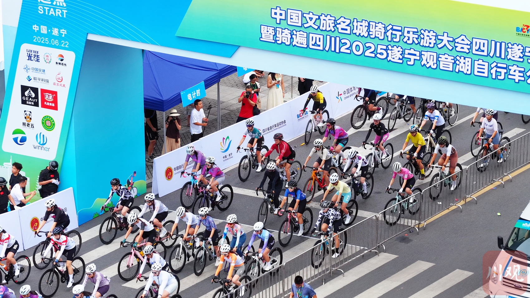 6月22日,中国文旅名城骑行乐游大会四川遂宁站暨骑遍四川2025遂宁观音湖自行车公开赛在该市河东新区五彩缤纷路鸣枪开赛,吸引全国1100余名选手共同领略遂宁“城在水中、水在城中”的独特风貌。
