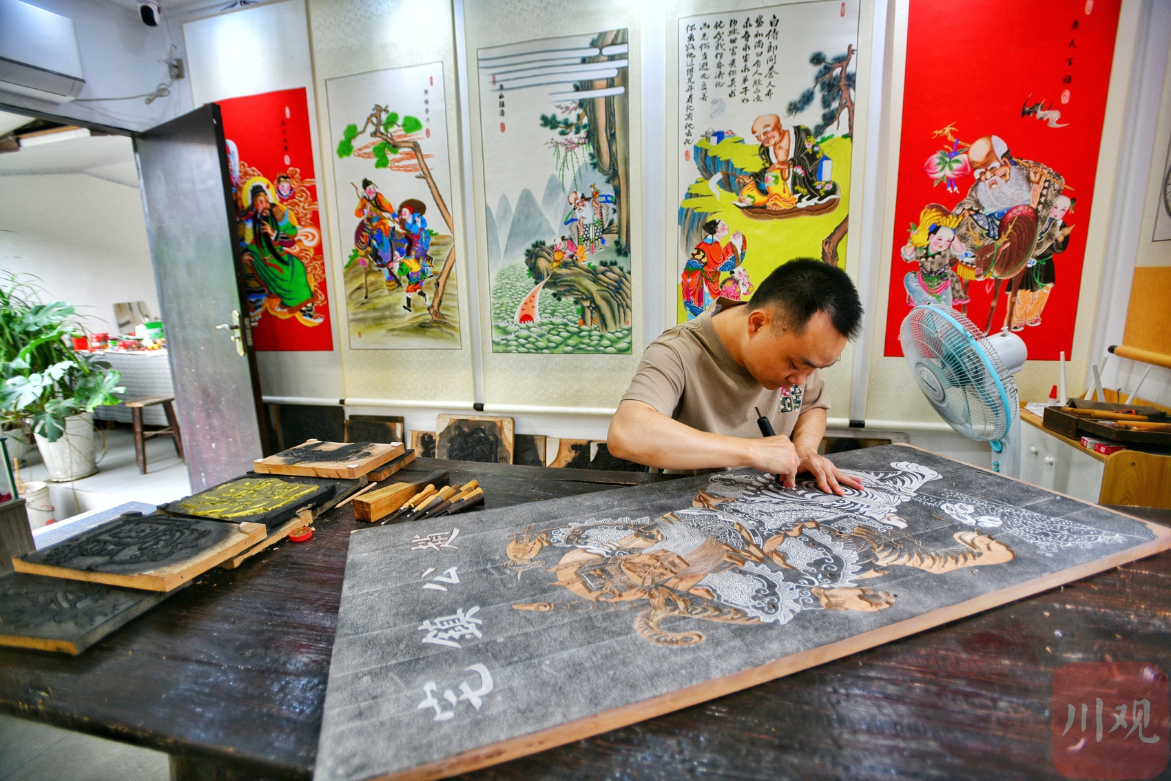 非遗传承人陈刚在刻年画木版。