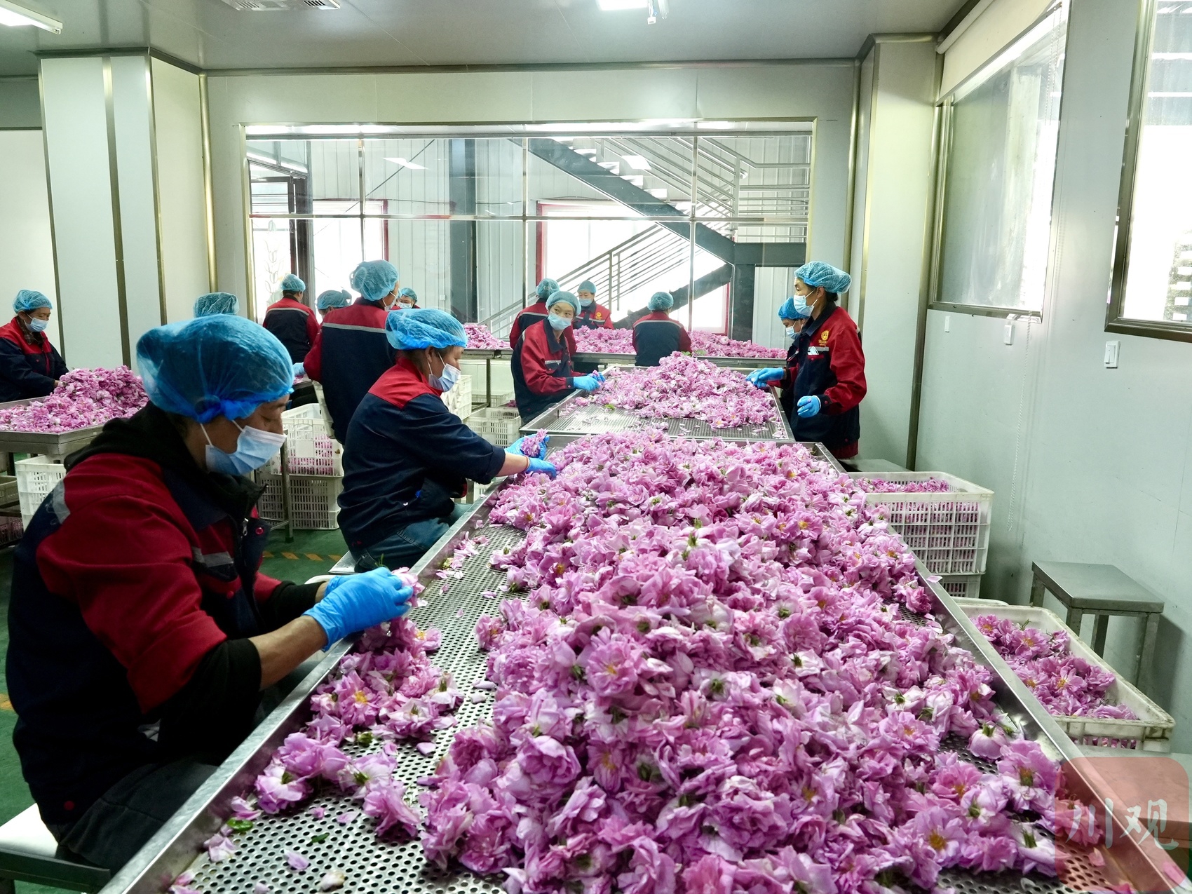 小金县达维镇冒水村玫瑰产业基地内工作人员进行玫瑰生产作业。