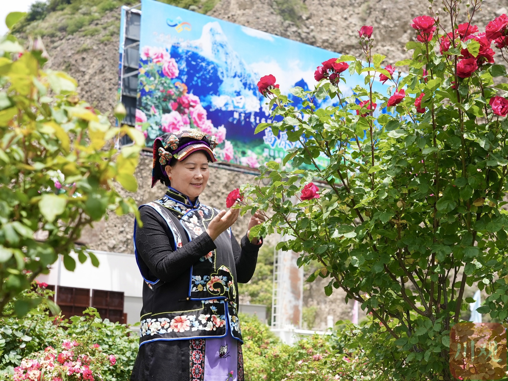 小金县达维镇冒水村党支部书记陈望慧在玫瑰生产基地内欣赏玫瑰花。