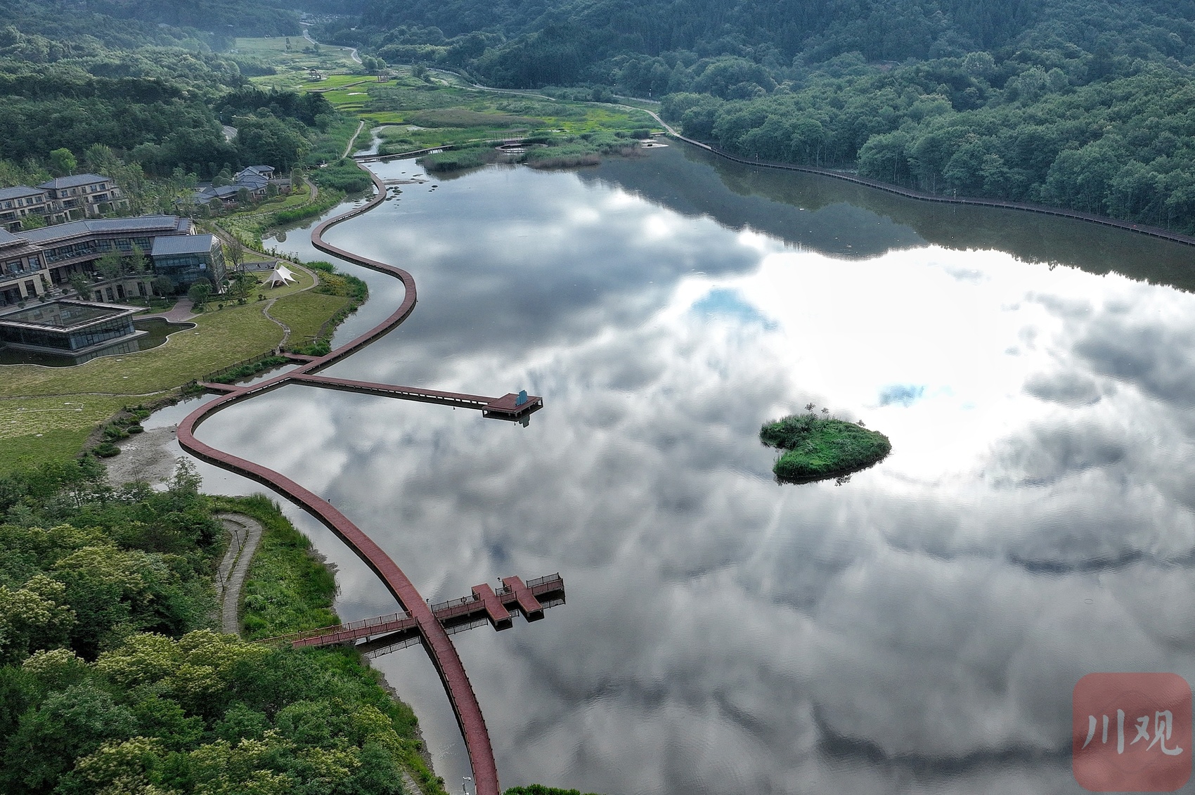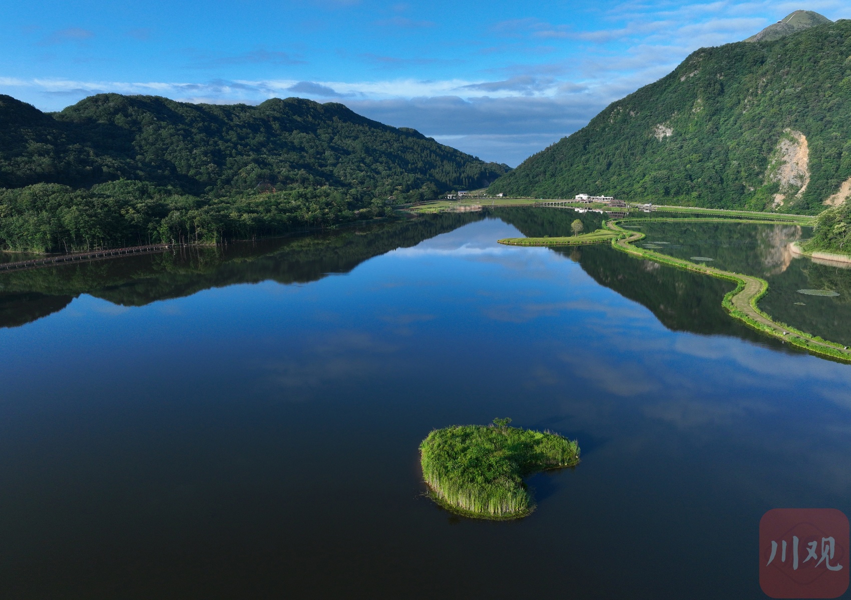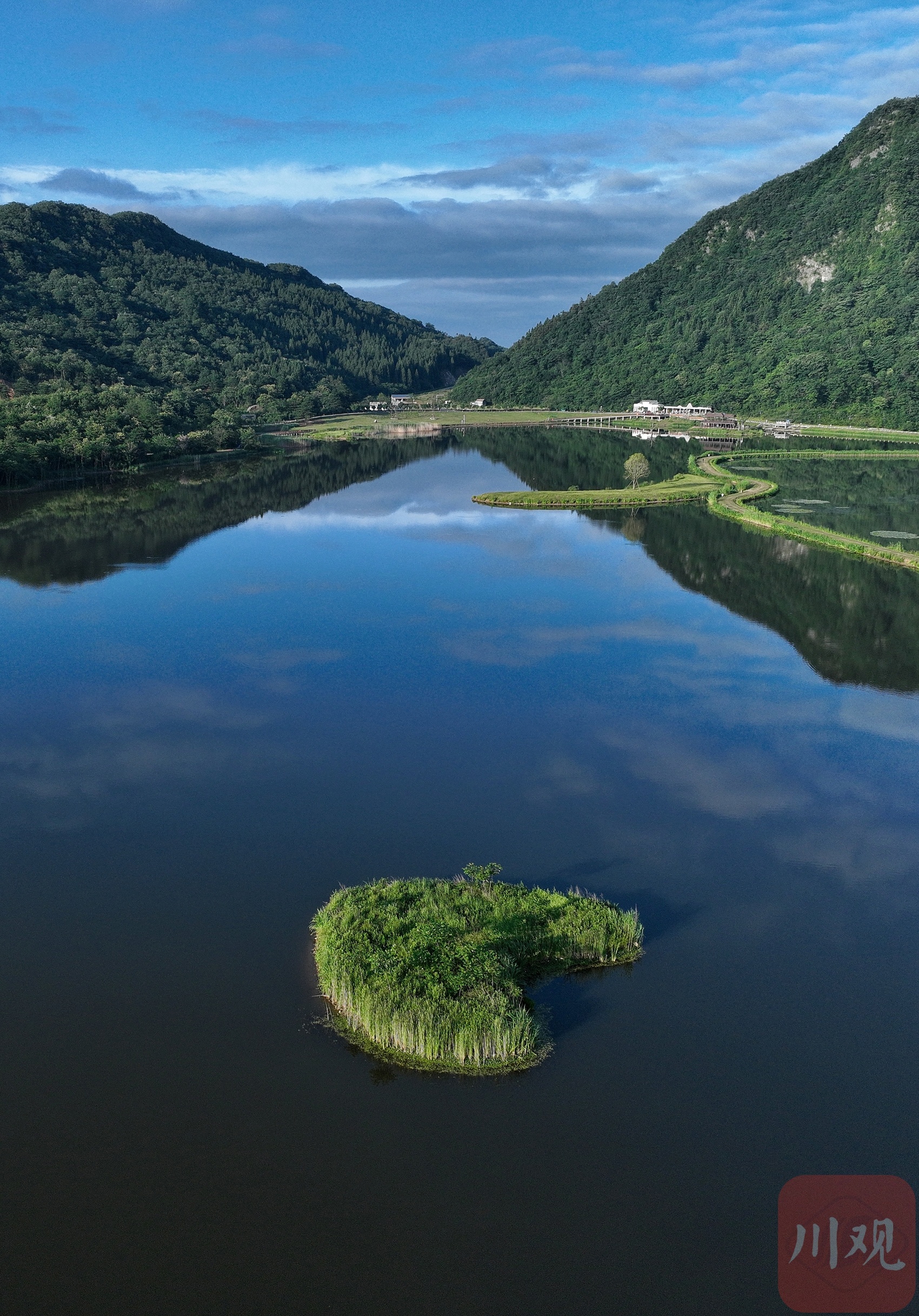 在这里,一湾湿地被打造成了如今的近月湖。6月26日清晨,阳光洒在静谧的湖面,“心形”绿岛犹如飘浮空中的绿舟,倒影成双。“月坝、月坝,有月亮就要有星星。”月坝旅游服务中心主任张菊容说,今年月坝成为“发现四川最佳观星点”,开始解锁“文旅+天文”新场景。