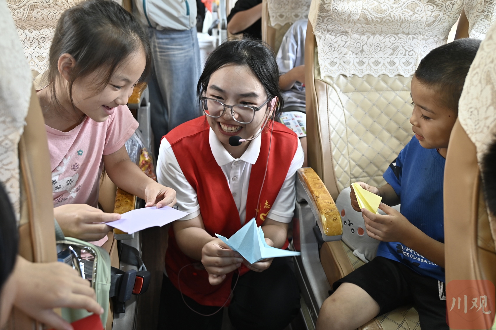 7月3日,志愿者在车上教孩子折纸。