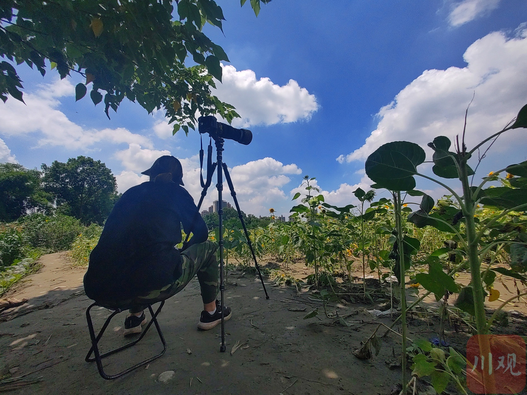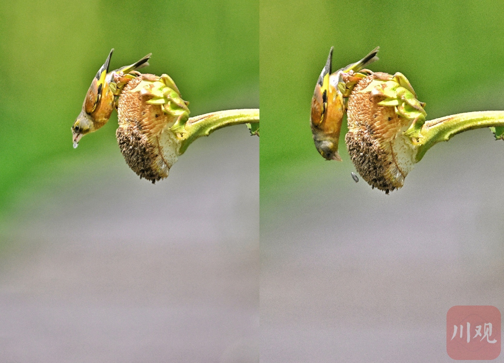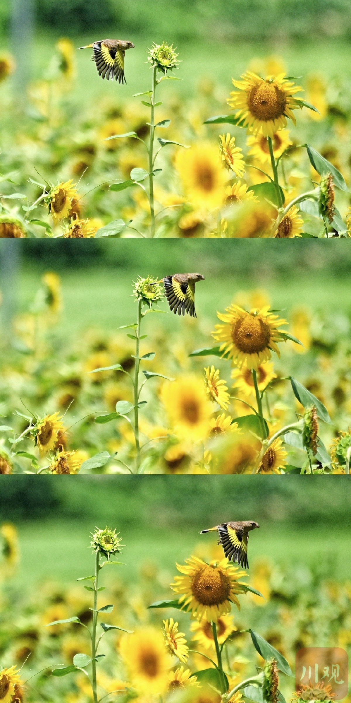 在城西的另一处向日葵观赏地——温江汪家湾花海,这里同样也是金翅雀争先“嗑瓜子”的乐园。金翅雀们啄食葵花籽的动作十分娴熟,它们或倒挂在花盘上,或瞬间悬停于满是籽实的花盘前,口衔葵花籽,用巧舌剥开取仁,瓜子壳瞬间分离,其啄食葵花籽的功夫行云流水,令人赞叹。山坡处卖饮料、零食的小姑娘告诉记者:“这里的观赏向日葵已进入尾声,这段时间很多游客都是来拍鸟、观鸟的。”一旁的张女士接着说道:“7月底,这里的粉黛乱子草就开了,到时粉红一片,也好看得很。”