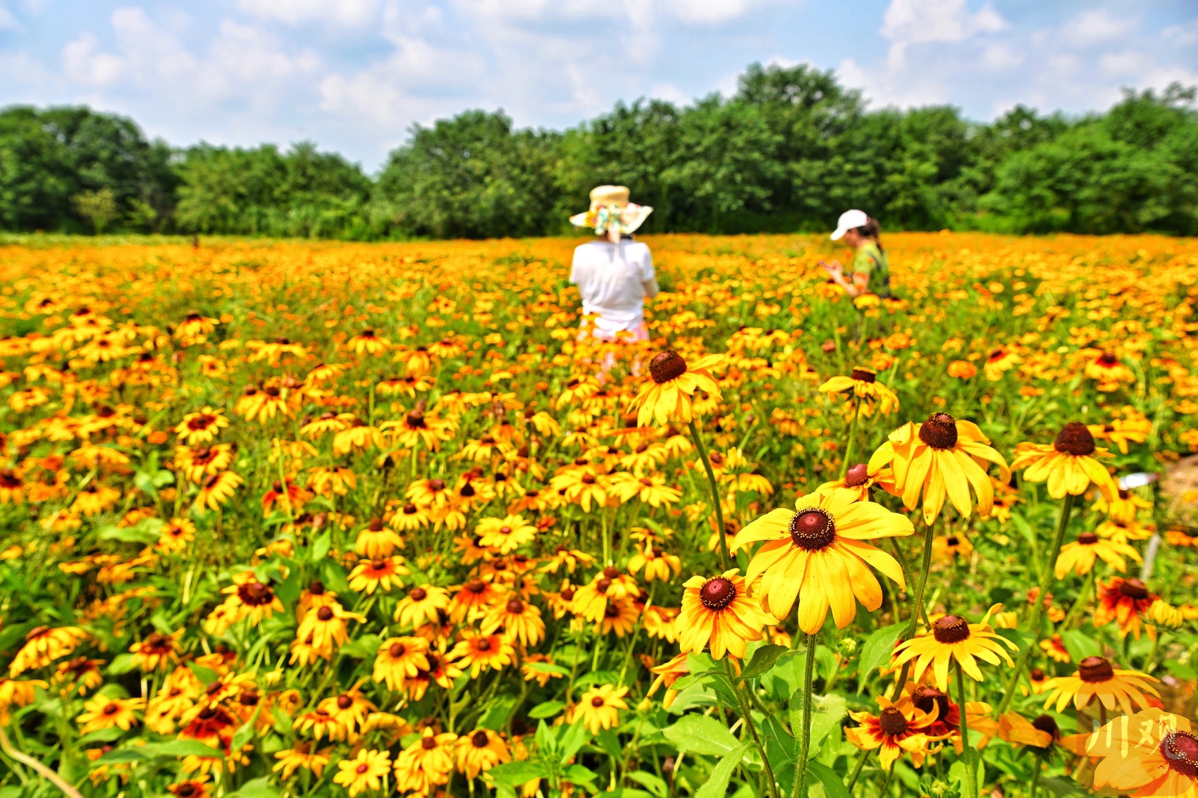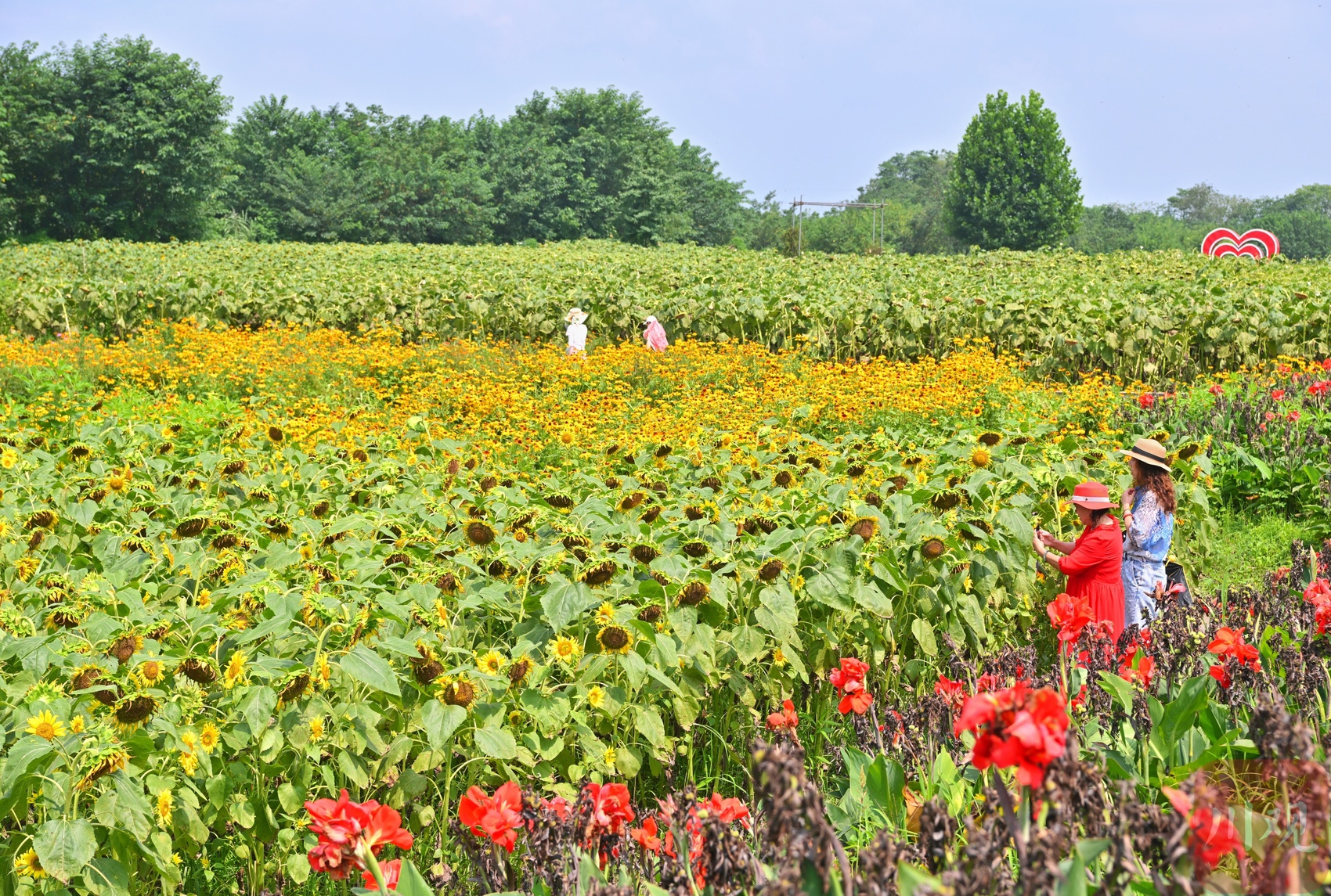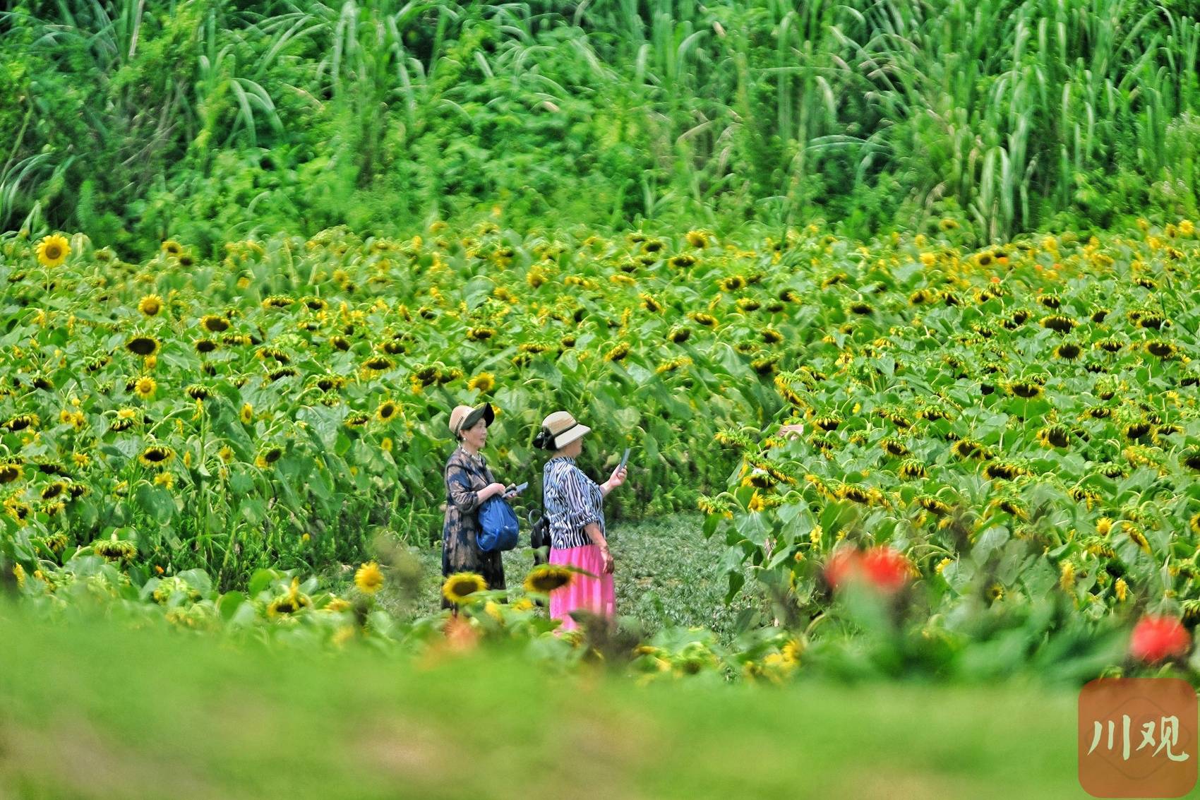 在城西的另一处向日葵观赏地——温江汪家湾花海,这里同样也是金翅雀争先“嗑瓜子”的乐园。金翅雀们啄食葵花籽的动作十分娴熟,它们或倒挂在花盘上,或瞬间悬停于满是籽实的花盘前,口衔葵花籽,用巧舌剥开取仁,瓜子壳瞬间分离,其啄食葵花籽的功夫行云流水,令人赞叹。山坡处卖饮料、零食的小姑娘告诉记者:“这里的观赏向日葵已进入尾声,这段时间很多游客都是来拍鸟、观鸟的。”一旁的张女士接着说道:“7月底,这里的粉黛乱子草就开了,到时粉红一片,也好看得很。”