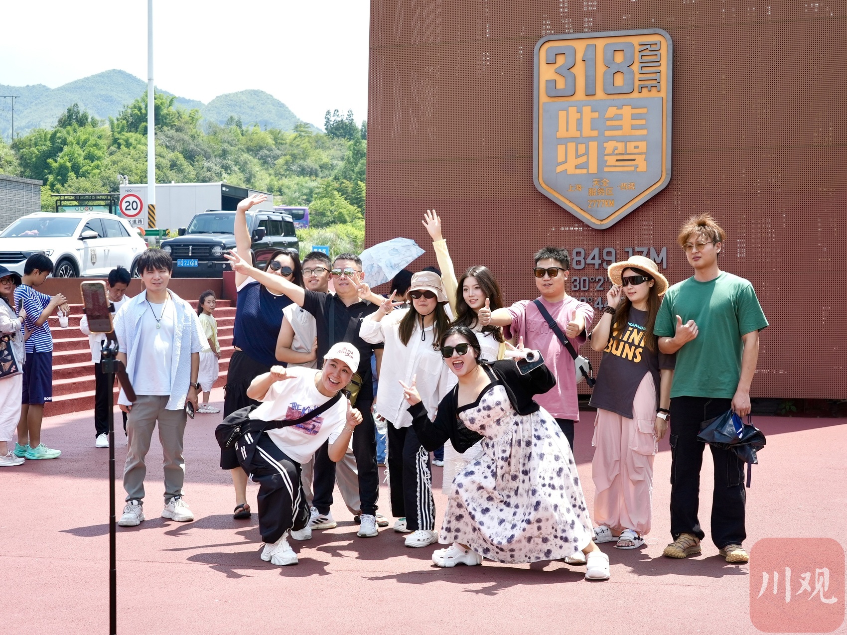 游客在服务区打卡点拍照。