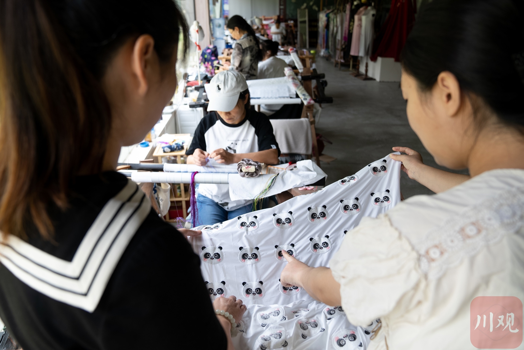 7月15日,成都市郫都区安靖街道的绣里·蜀绣融合创新产业园内,绣娘正在查看制作的“蜀宝”形象绣片。