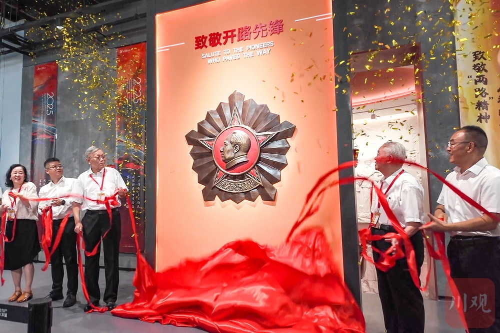 揭幕环节,随着红色幕布的拉下,金色彩带和纪念徽章墙体的颜色交相辉映,“康藏天路·精神永续”致敬厅出现在眼前。