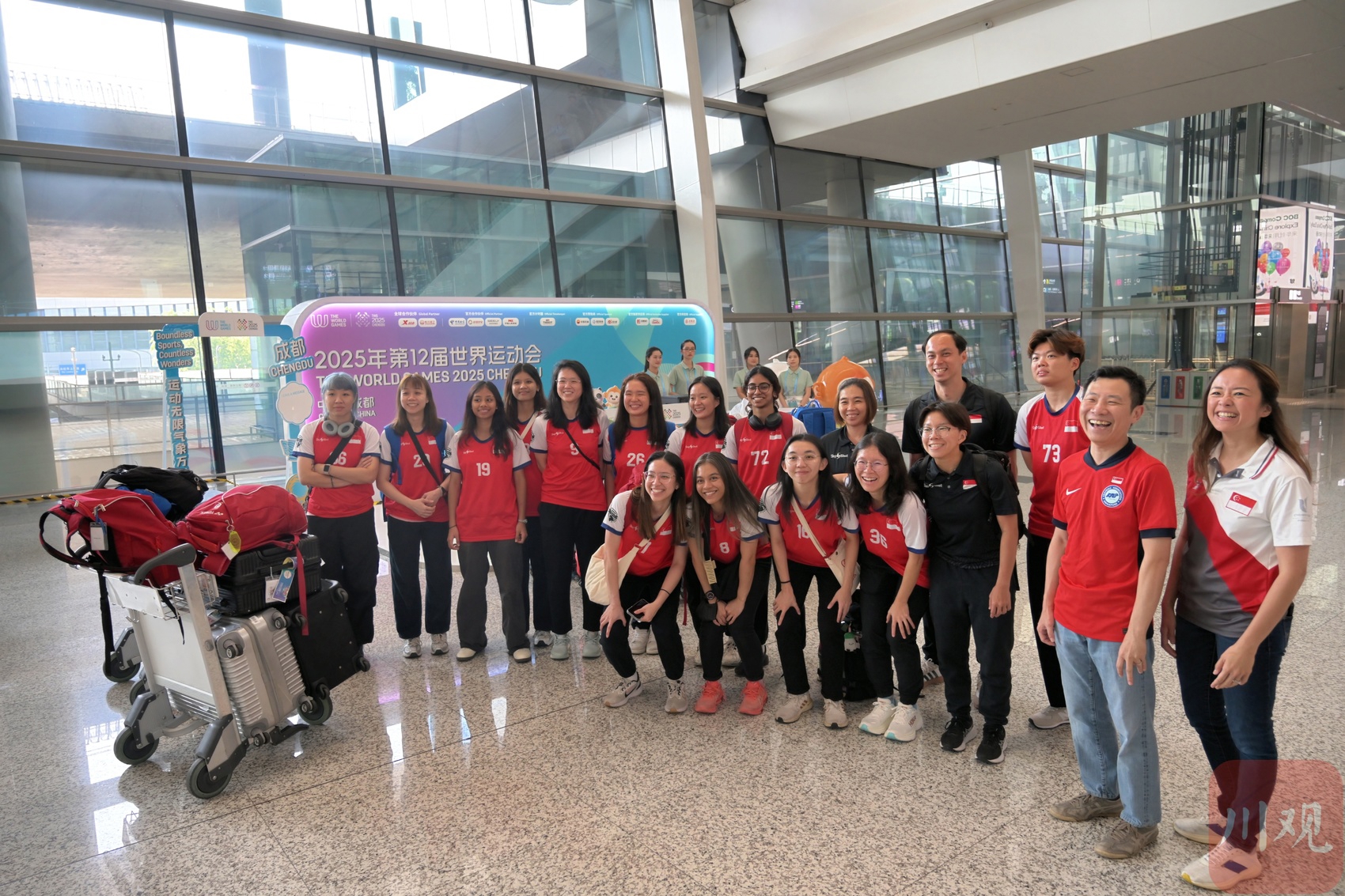 抵达成都天府国际机场的新加坡运动员们合影留念