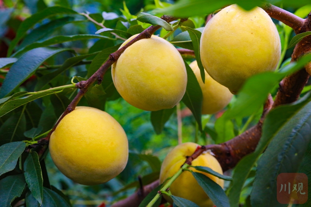 “依托大渡河河谷独特的气候条件和1200余米的平均海拔,使得我们这里全年日照超过3000小时,昼夜温差达15℃以上。优越的自然环境,让这里的黄桃积累了充足的果糖,也使得黄桃的果肉更为紧实,果香也愈发浓郁。”安顺场镇党委副书记、镇长杨超表示,自2016年先后引进锦绣黄桃、皮球桃、六月锦香等12类优质黄桃品种以来,安顺场镇采取“党政+农场+合作社+基地+农户+脱贫户”模式,已发展黄桃3000余亩,年产量超过150万公斤。