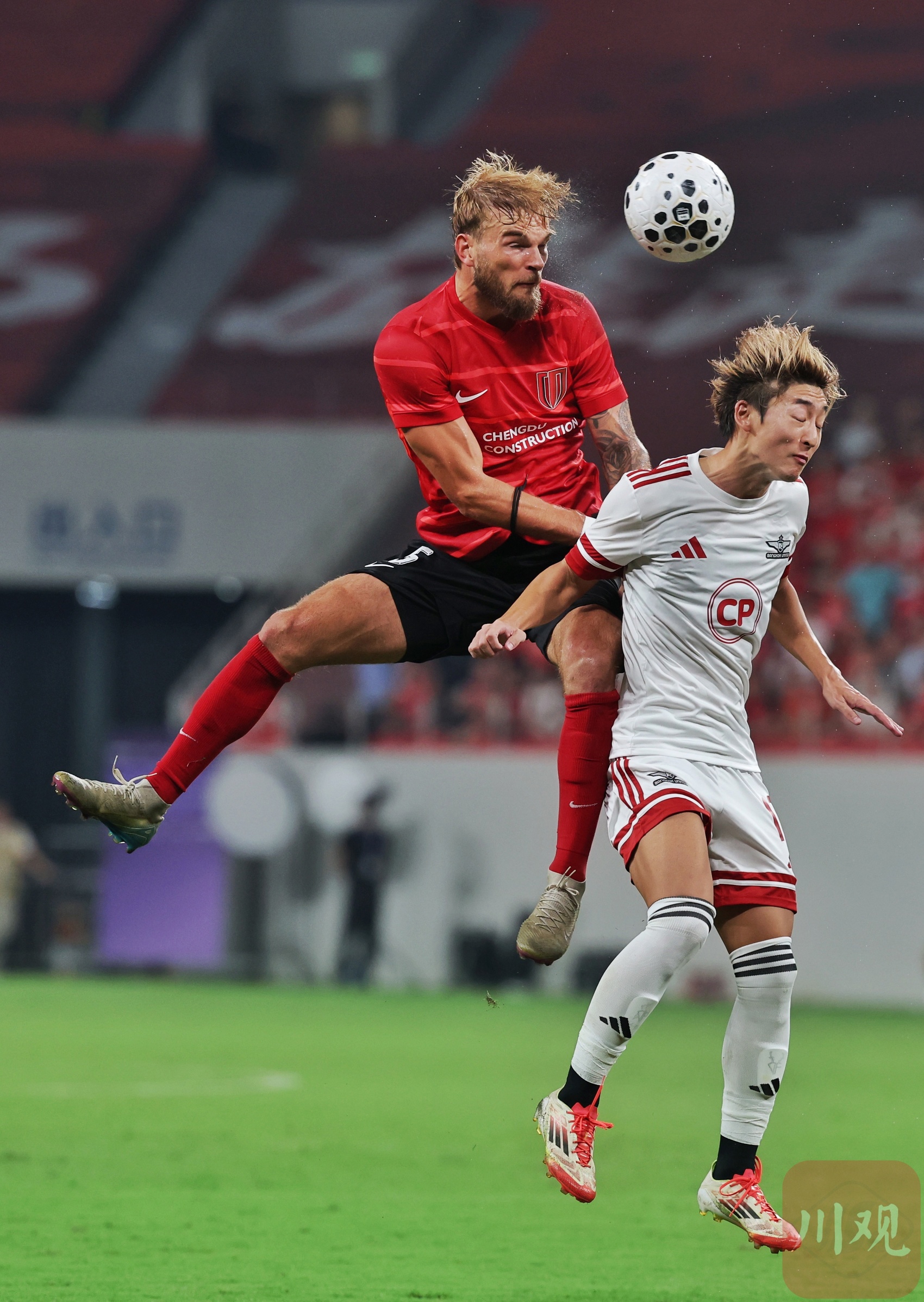 成都蓉城队员5号争头球。