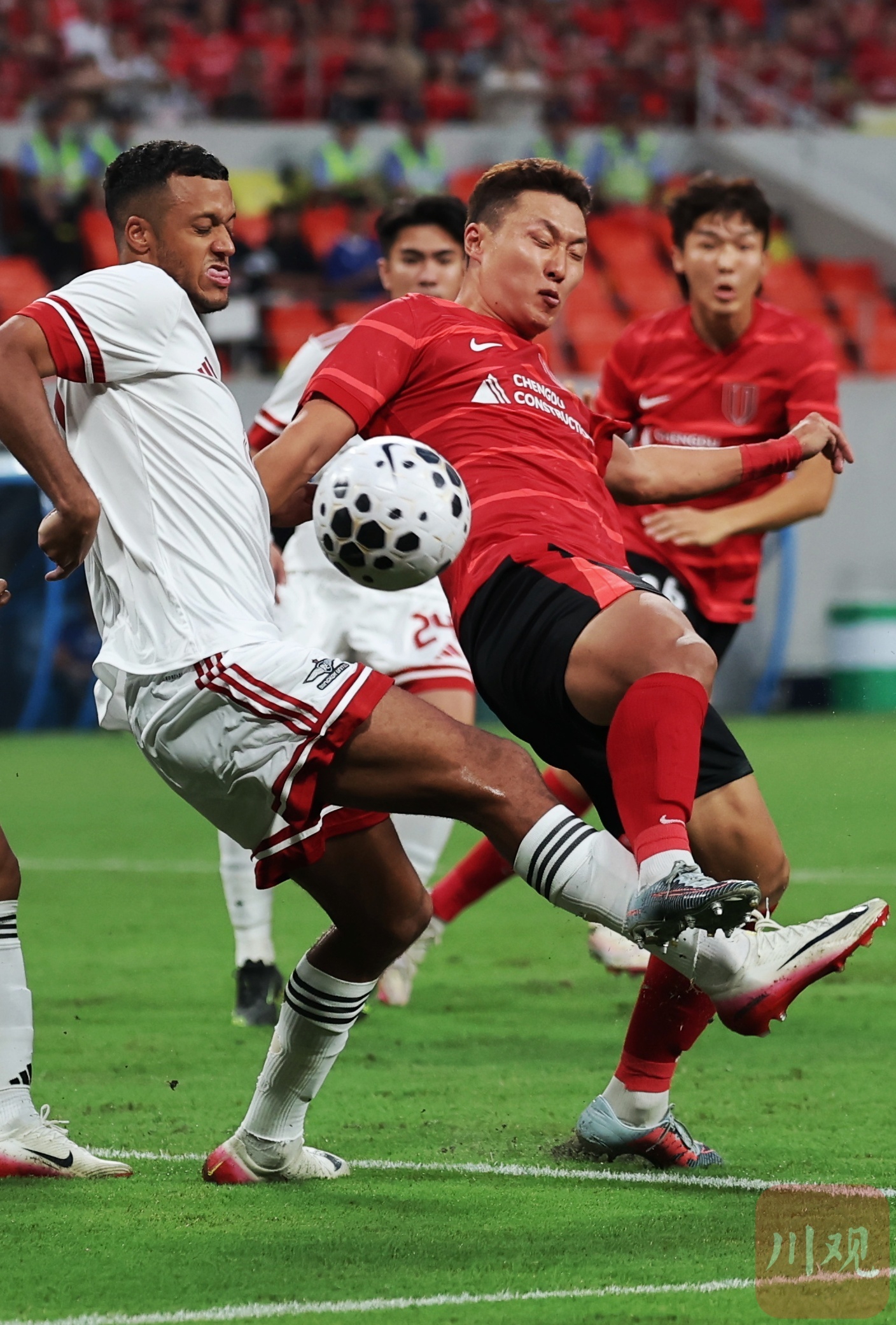 成都蓉城队员(红衣)在前场拼抢。