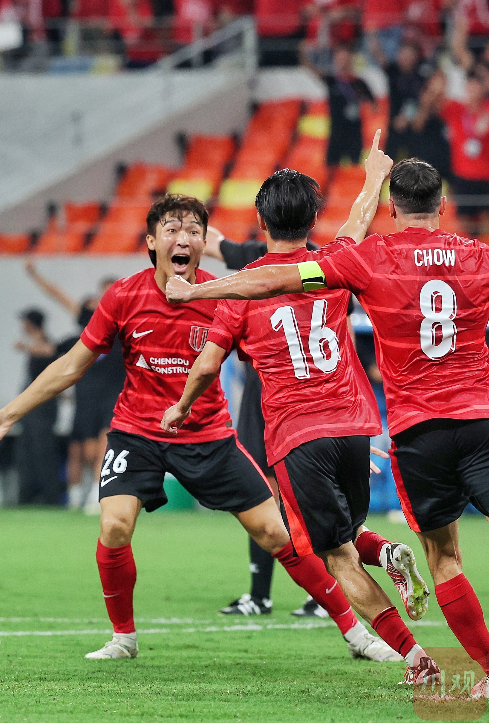成都蓉城队员16号杨明洋欢呼进球。