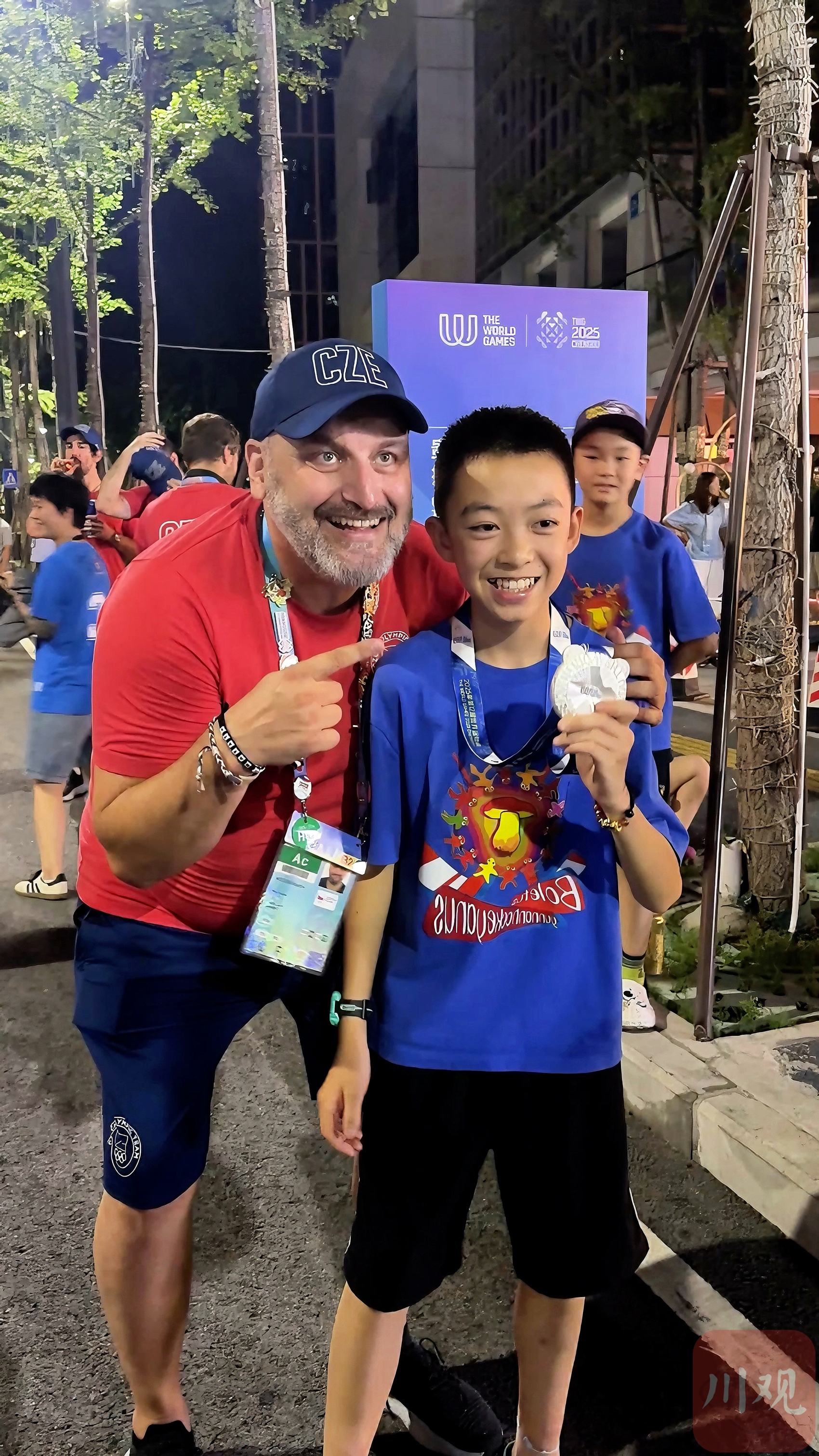而赛场外,捷克队员却收获了一批中国球迷的强势应援。来自云南的四个轮滑家庭,用捷克语喊着“捷克加油”,队员们把刚拿到的银牌,轮流戴在孩子们身上,合照、签名、送球衣,暖心的互动,让队员们露出笑容,一扫输球的沉闷。