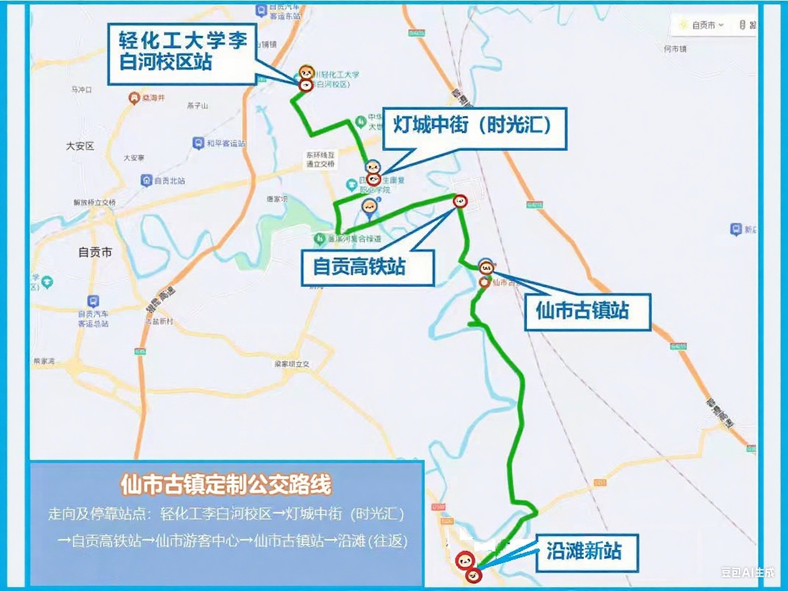为方便市民参与,活动当天(14:00-21:00)还提供免费定制公交服务,线路途经四川轻化工大学(李白河校区)、四川卫生康复职业学院(时光汇)、高铁自贡站、仙市古镇及沿滩新站(沿滩61路公交始发站)。首班车于14:00从四川轻化工大学(李白河校区)发车,各站点停靠时间为5分钟。