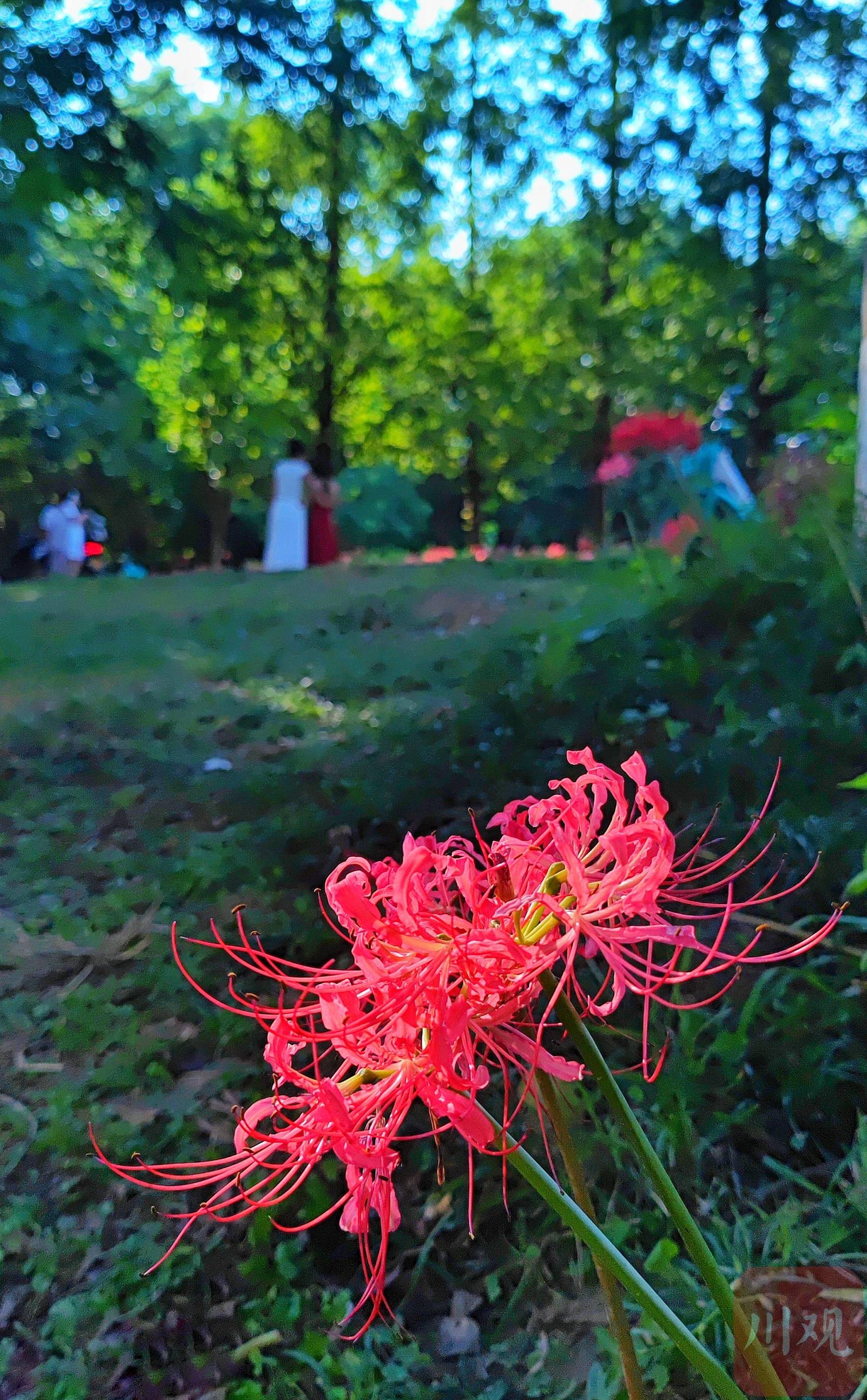 在石蒜花群里拍照打卡的市民。