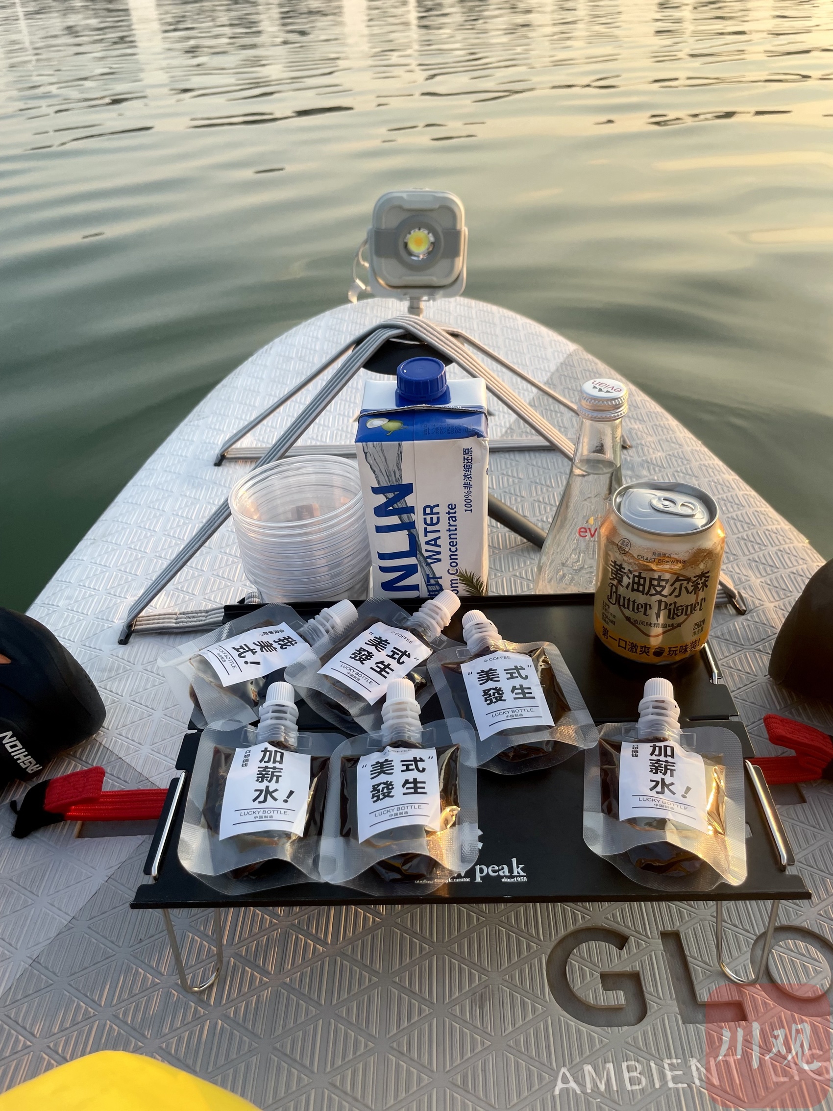 由于咖啡机等重物无法下水,梁晓虎会提前备好咖啡液和各类饮品原料,傍晚时再用防水袋装着调制好的咖啡及其他饮品上浆板出摊,一般要到晚上10点左右板友们陆续回家才收摊。