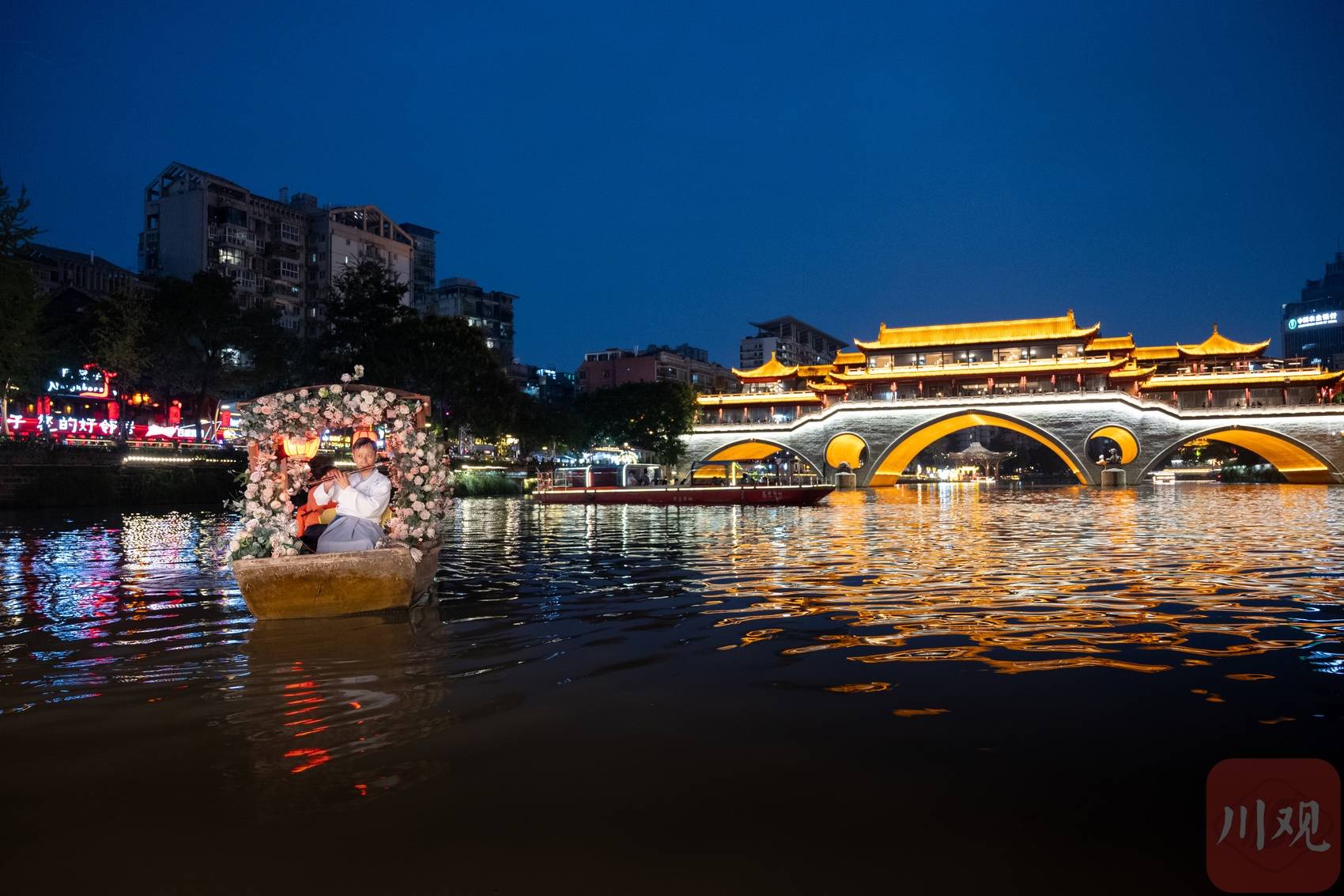 夜游锦江以 20公里水上黄金线为轴,以10大码头为节点,串联起沿江的商业、文化、旅游等多元业态,创新构建“水、岸、街、坊、船”“五位一体”的消费新场景。游客不仅能在船上沉浸式体验两岸光影交错的美景,还能选择特色主题餐饮、旅拍、主题游线等多样化服务,尽情享受夜游的乐趣。下船后,还可沿岸探访码头特色市集、文创空间与主题餐饮。这种水岸联动的多元消费模式,有效延伸了消费链条,创造了更加丰富的夜间消费场景。